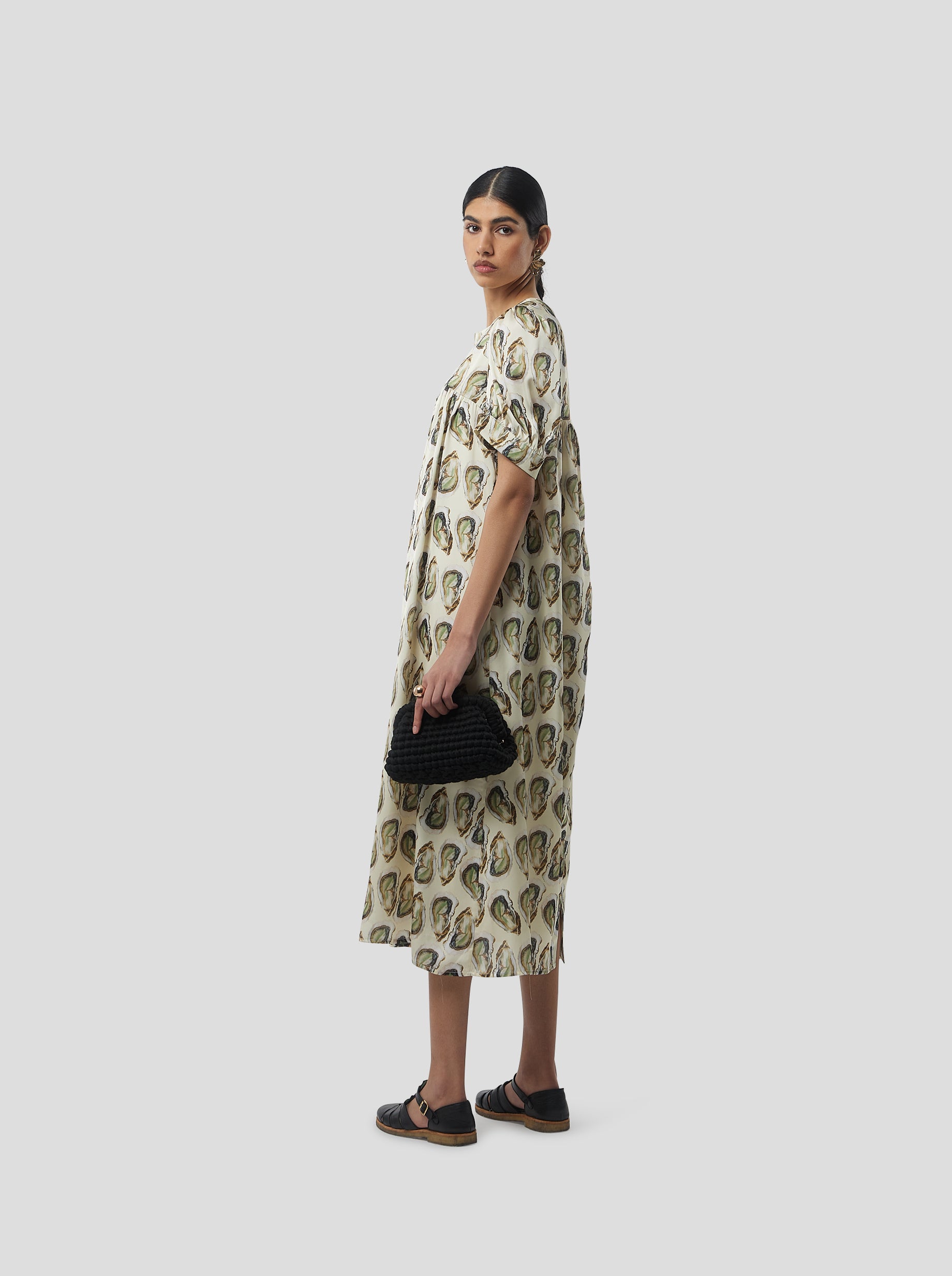 About the print : The Lustruous Oyster print, inspired by the colors and texture of an oyster shell, expresses a confident femininity, balancing mineral strength with hidden sensuality.
