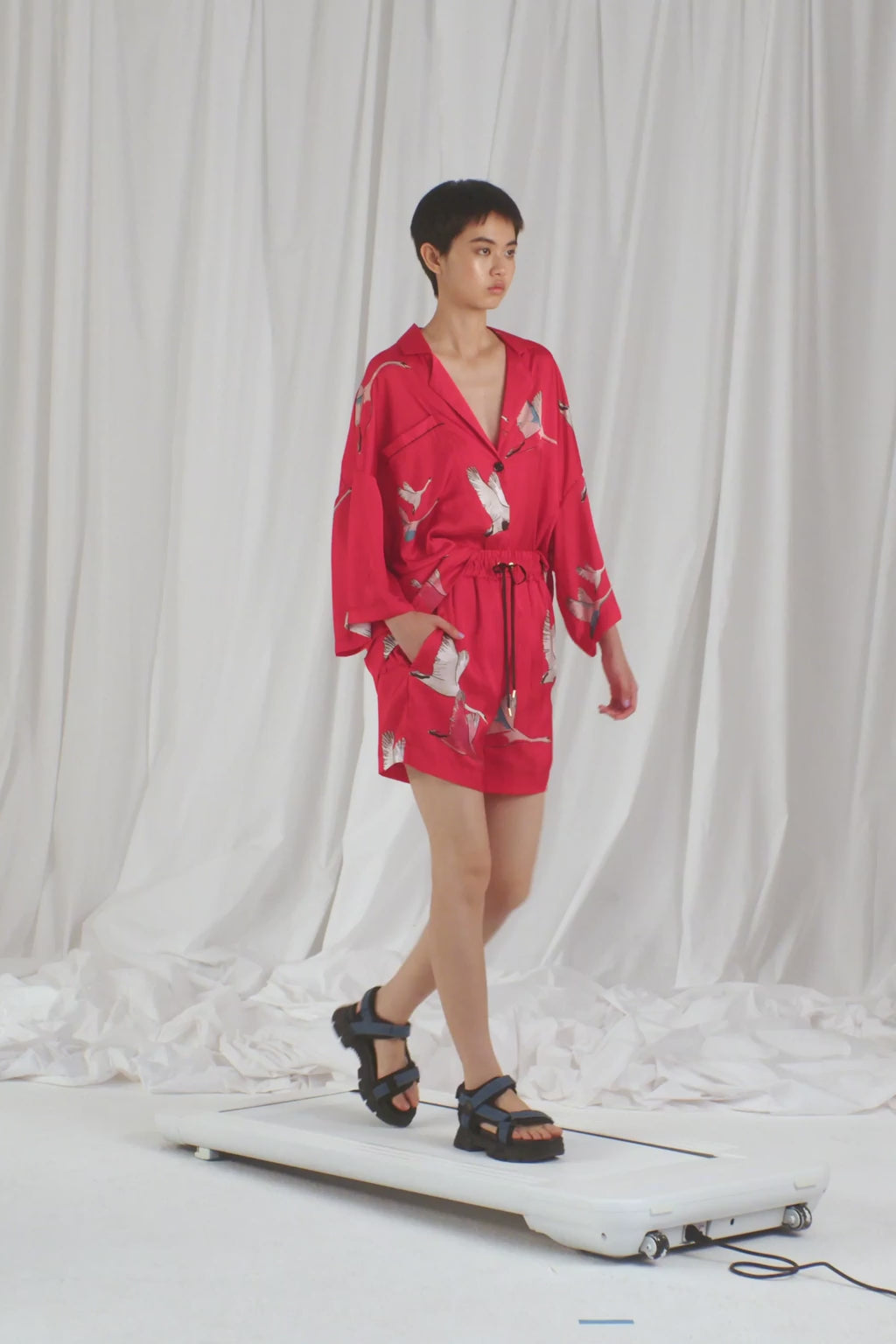 The Pyjama Eilish in pink Swan print is composed of a wide shirt with a slightly open V-neck, loose shorts with an elasticated belt and a red drawstring. Crafted in recycled polyester.