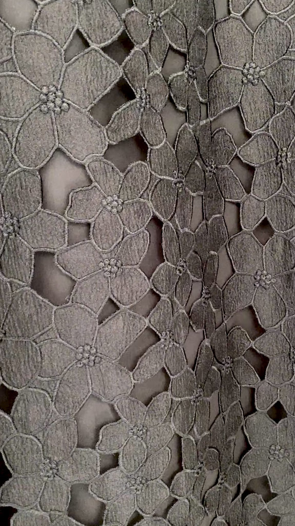 About the fabric: The black Laurier Brûlé lace shapes a silhouette that is both bold and radiant, while preserving a sense of delicacy thanks to its finely crafted openwork pattern.