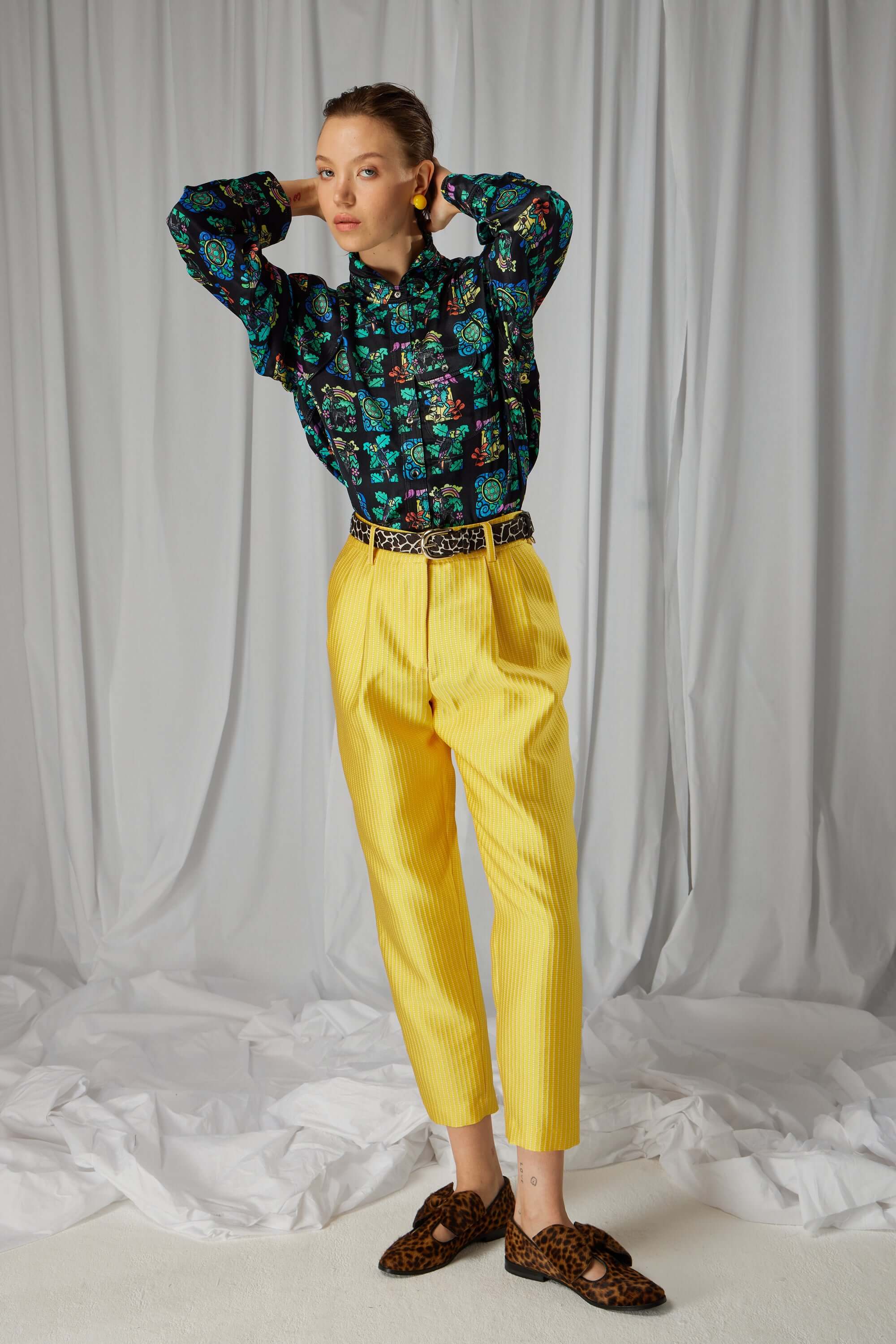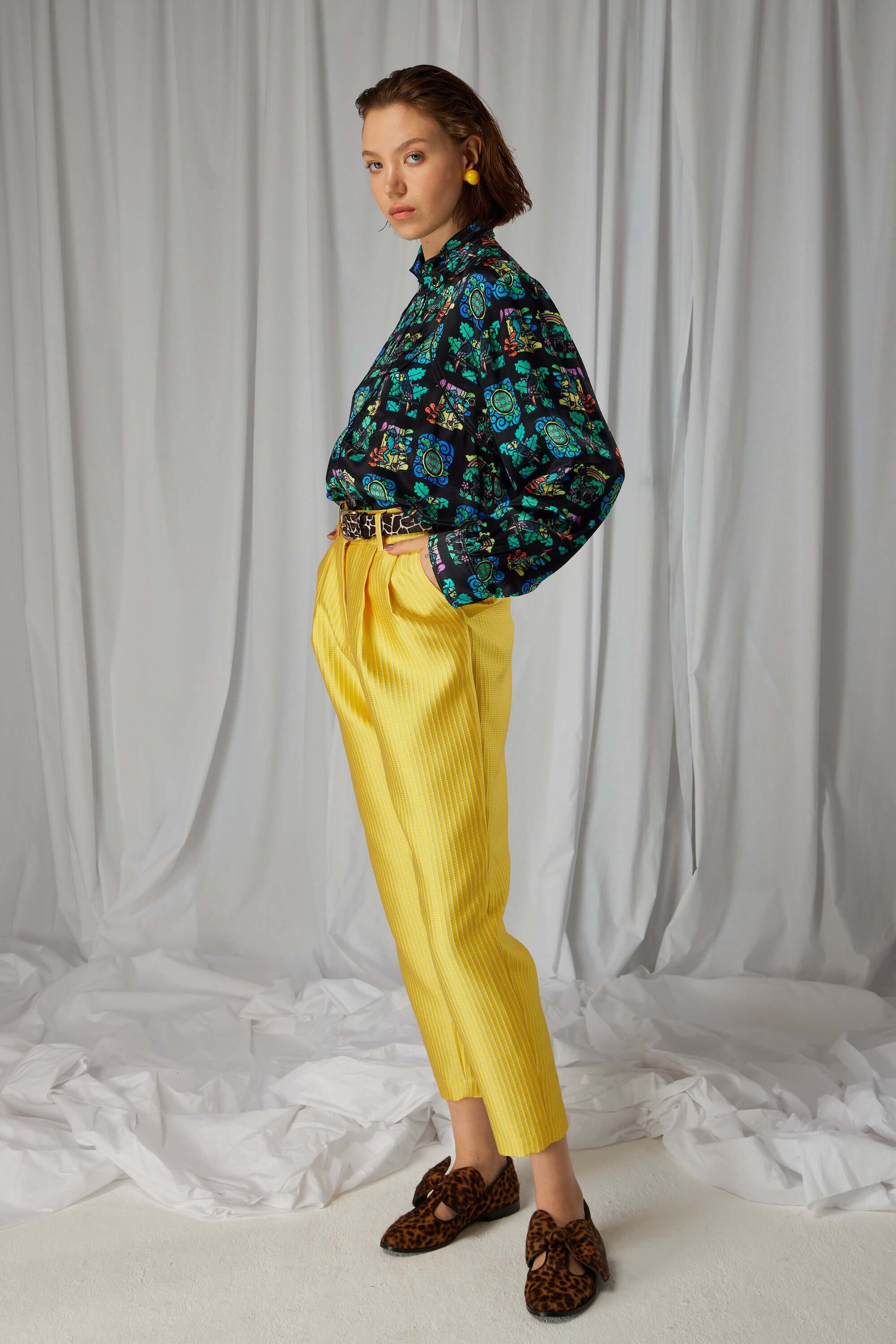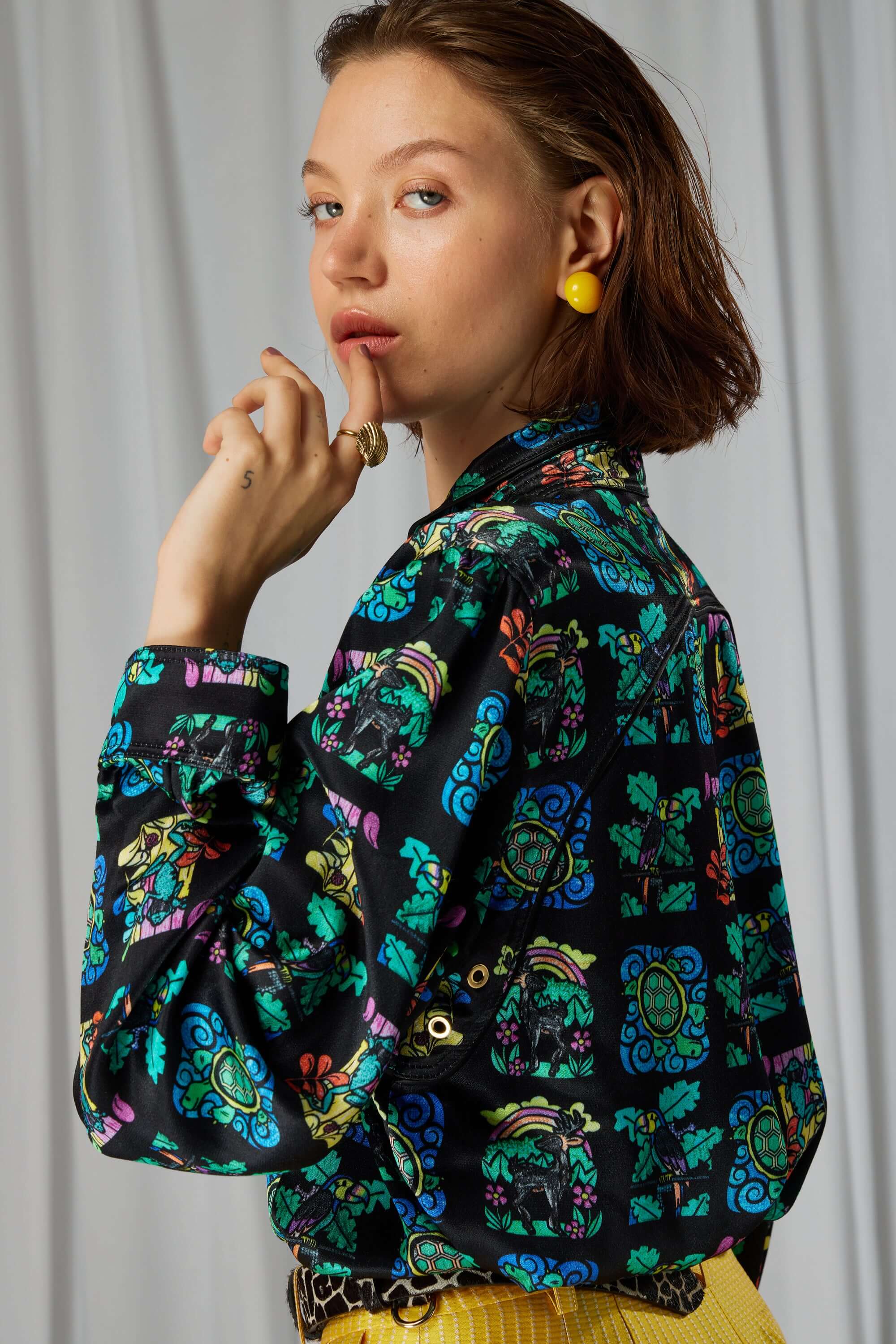 The Tokyo shirt is made in the regressive Moonlight print, composed of small animal designs declined to infinity. Made in a light viscose, its fall is fluid. Wide with fitted shoulders and full sleeves, it features a high Mao collar, inspired by traditional Asian outfits.