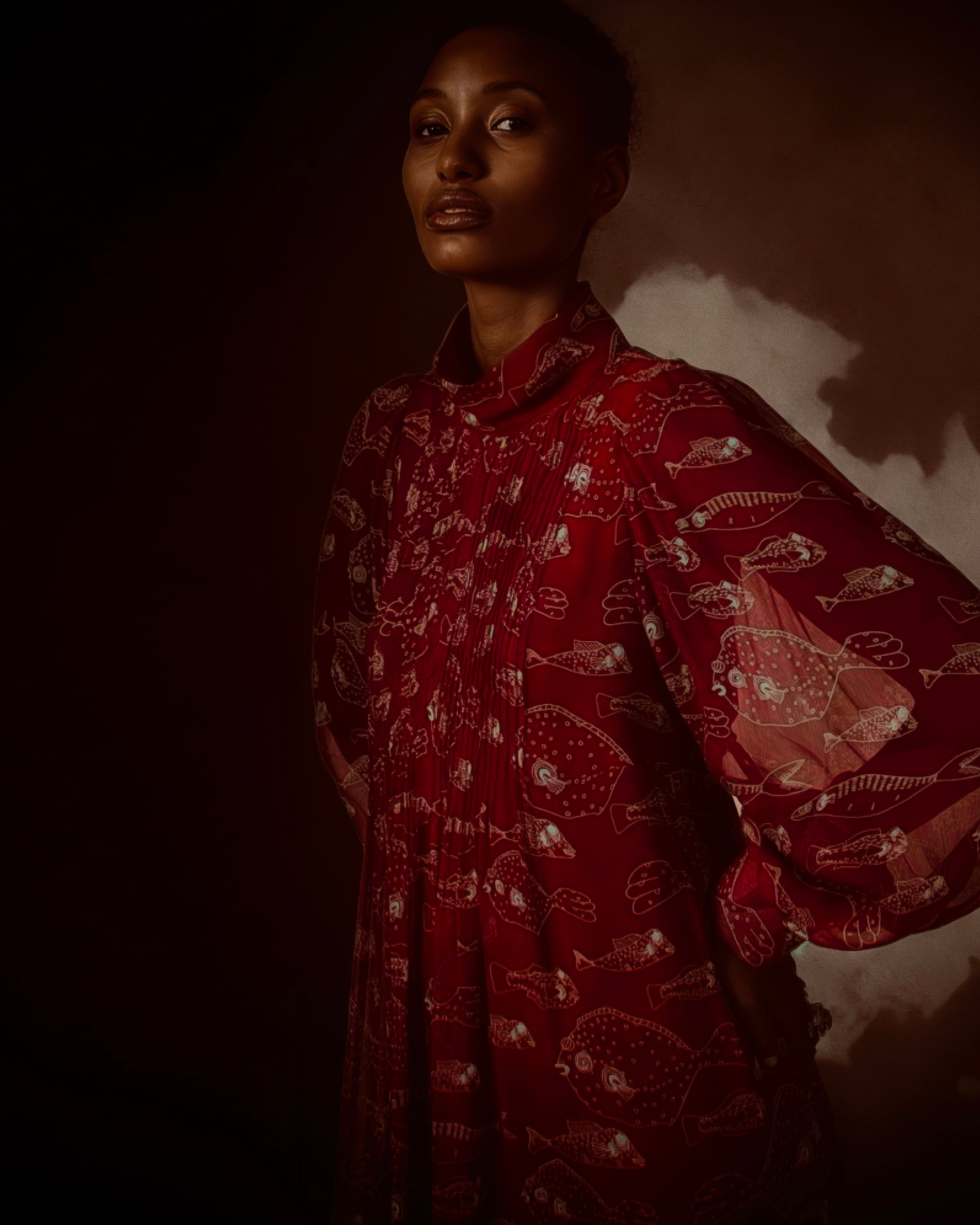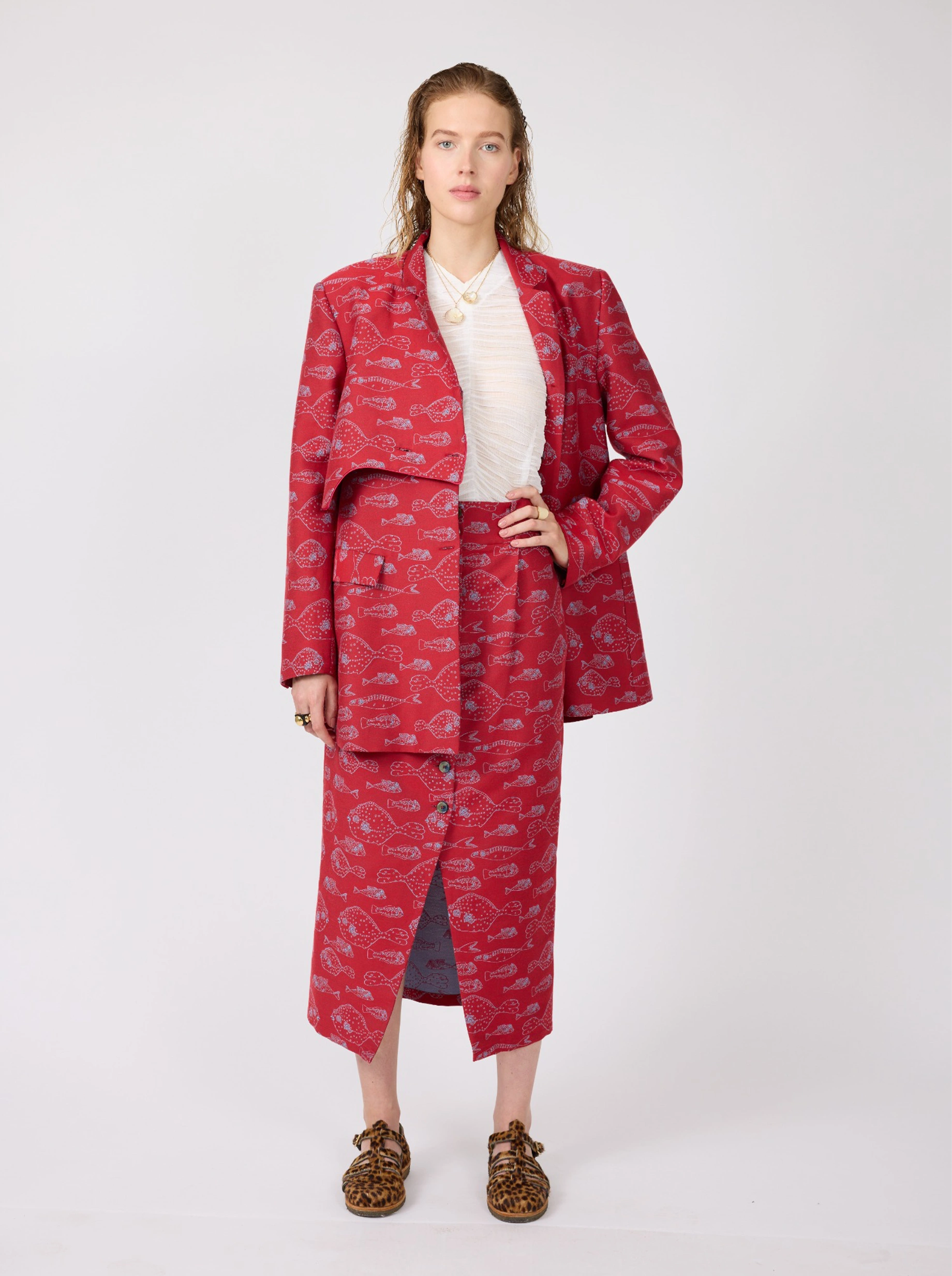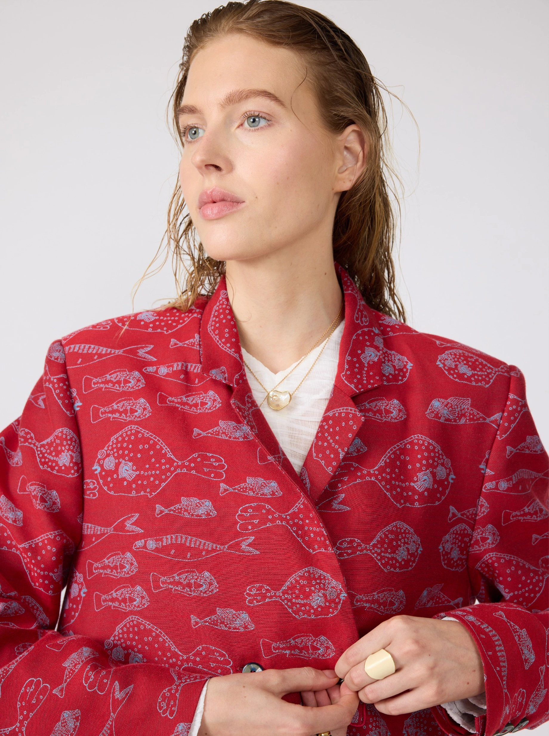 At the heart of this capsule lies a tapestry of innovation and artistry, brought to life through four exceptional new fabrics. These materials weave a narrative where textures and colours unite to craft silhouettes that are as distinctive as they are captivating. Taking center stage is the exclusive Fish Tank print, a design that epitomizes creativity and elegance. Hand-drawn by Alix Petit, this unique motif serves as the unifying thread of the collection. Its intricate sky-blue lines dance across a striking deep red background, evoking a sense of movement and depth, much like the ripples of water in a serene tank.