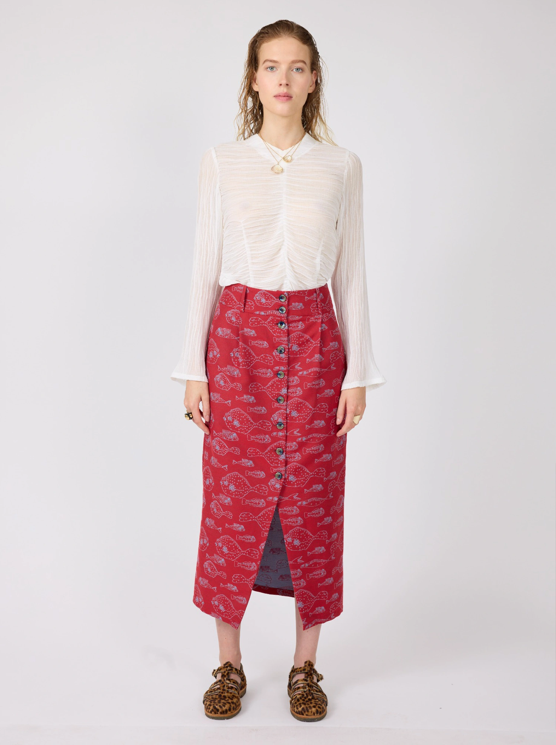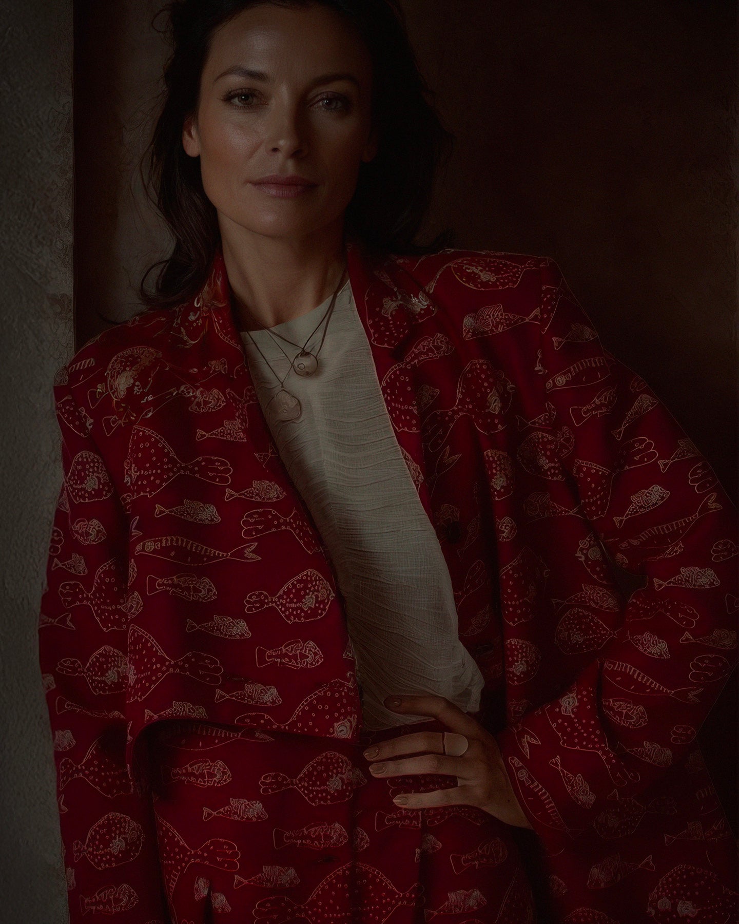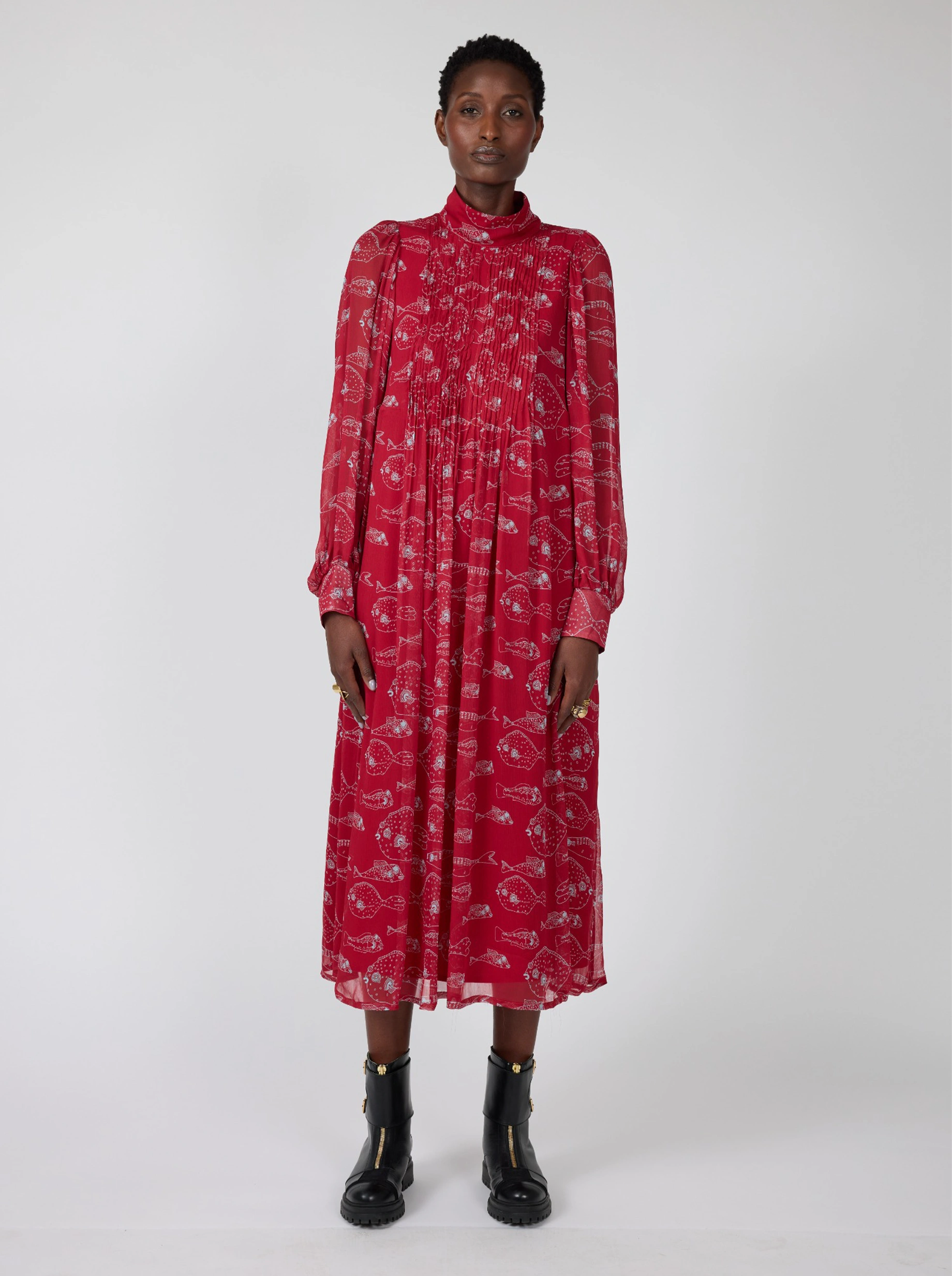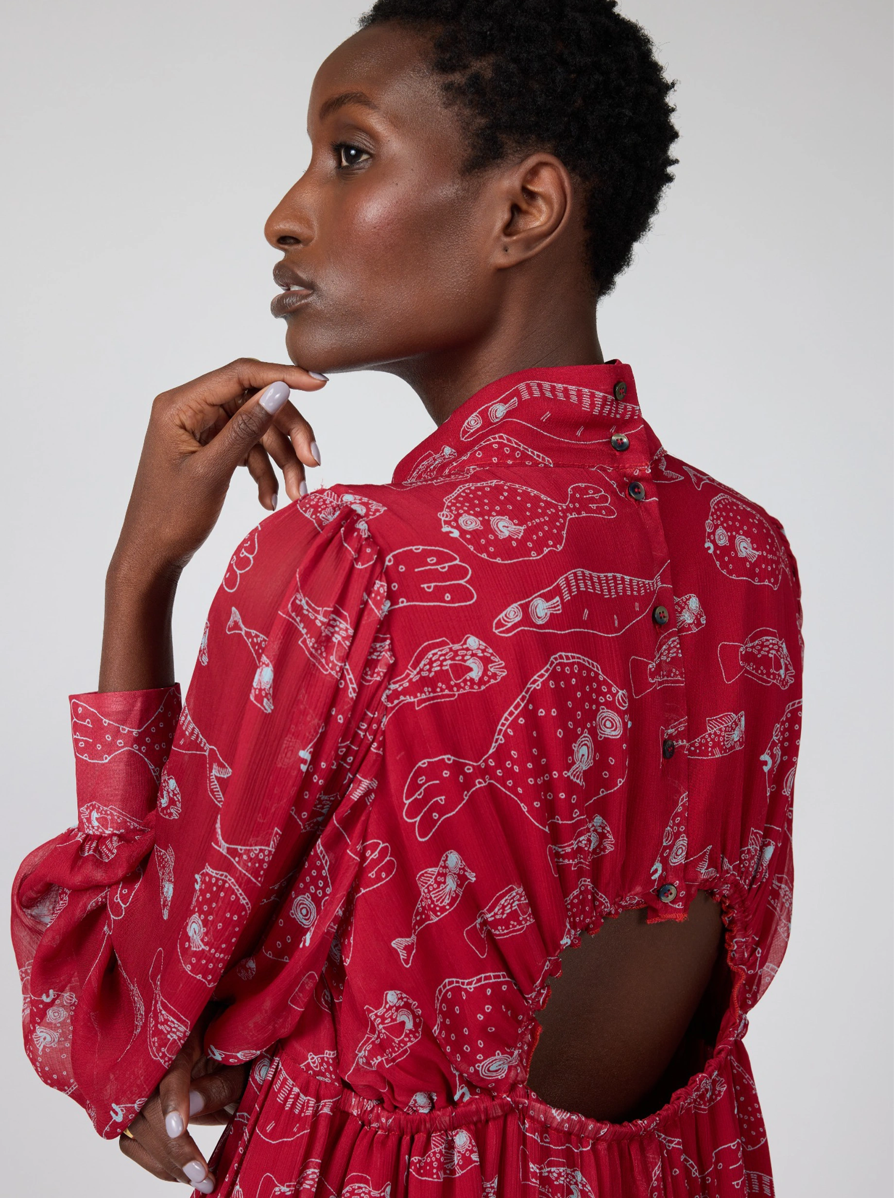 At the heart of this capsule lies a tapestry of innovation and artistry, brought to life through four exceptional new fabrics. These materials weave a narrative where textures and colours unite to craft silhouettes that are as distinctive as they are captivating. Taking center stage is the exclusive Fish Tank print, a design that epitomizes creativity and elegance. Hand-drawn by Alix Petit, this unique motif serves as the unifying thread of the collection. Its intricate sky-blue lines dance across a striking deep red background, evoking a sense of movement and depth, much like the ripples of water in a serene tank.