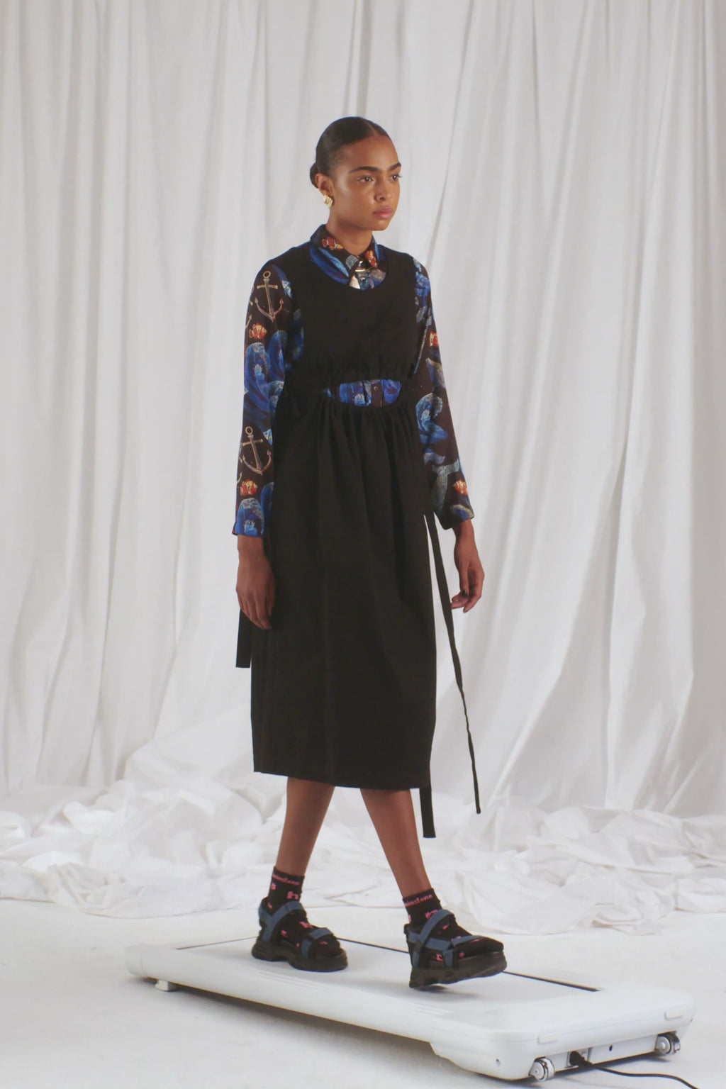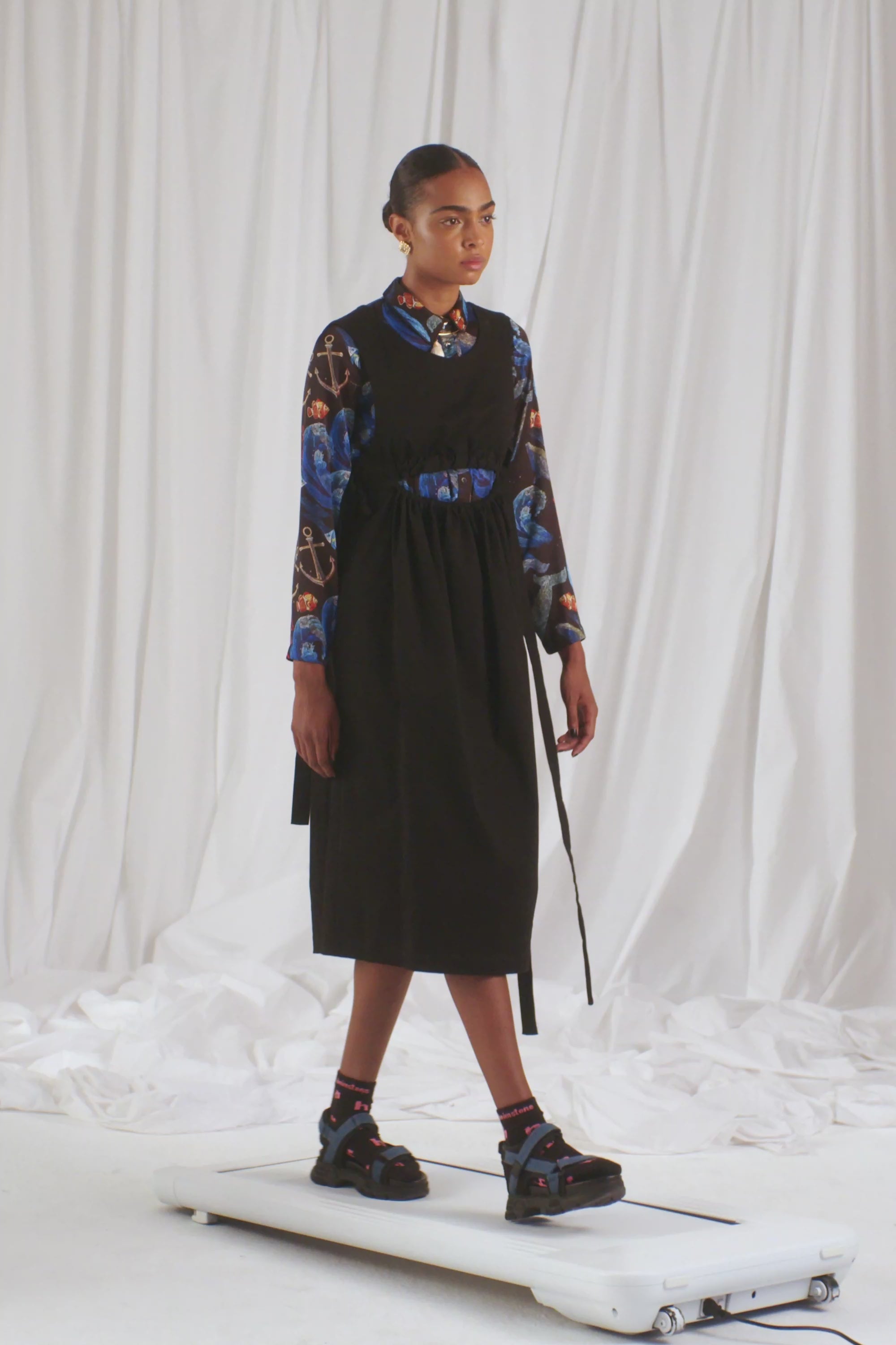 The Edison dress is a shirt dress with fitted shoulders and ample body. Available in Storm print, it has a black ribbon at the waist with golden tips to adjust it. It closes on the front with tone on tone buttons. Its collar is masculine type highlighted by a black piping.