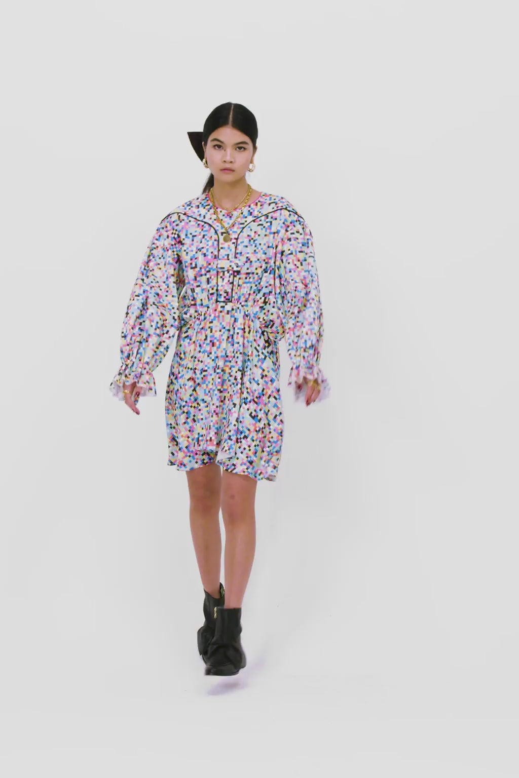 Always in a logic that advocates the play of colours and materials, Alix has declined the Trigalière dress, the cousin of our iconic shirt of the same name. It stands out with its wide sleeves with smoked cuffs and its light elasticated skirt that make it sophisticated. Its pink piping on the collar and black piping on the bust harmonize with the Pixels print that cuts out the details of the bust of the dress.