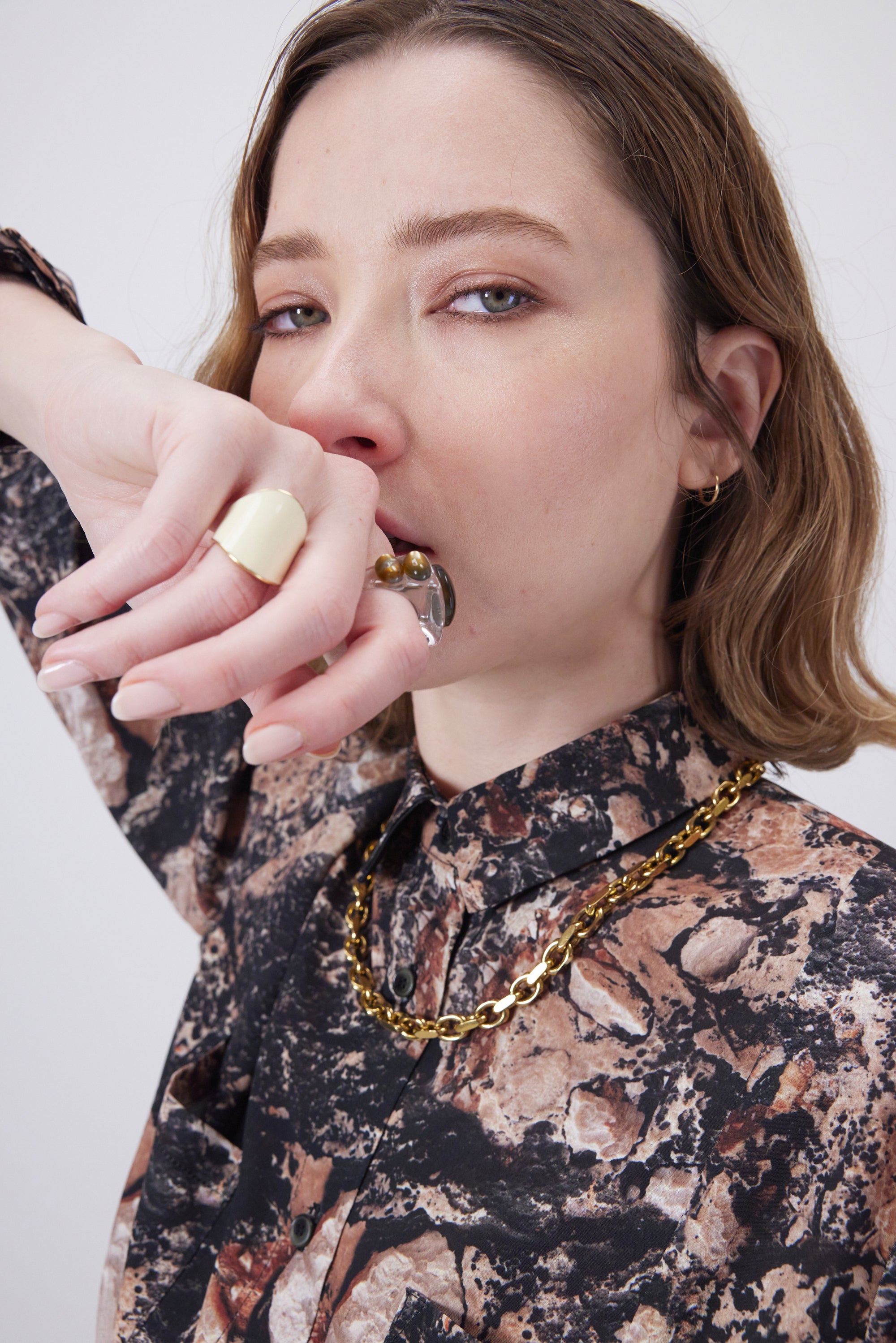 Fabriquée dans un polyester, la chemise Dori porte notre riche et délicat imprimé Trail, réalisé dans une combinaison chromatique minérale. Elle présente