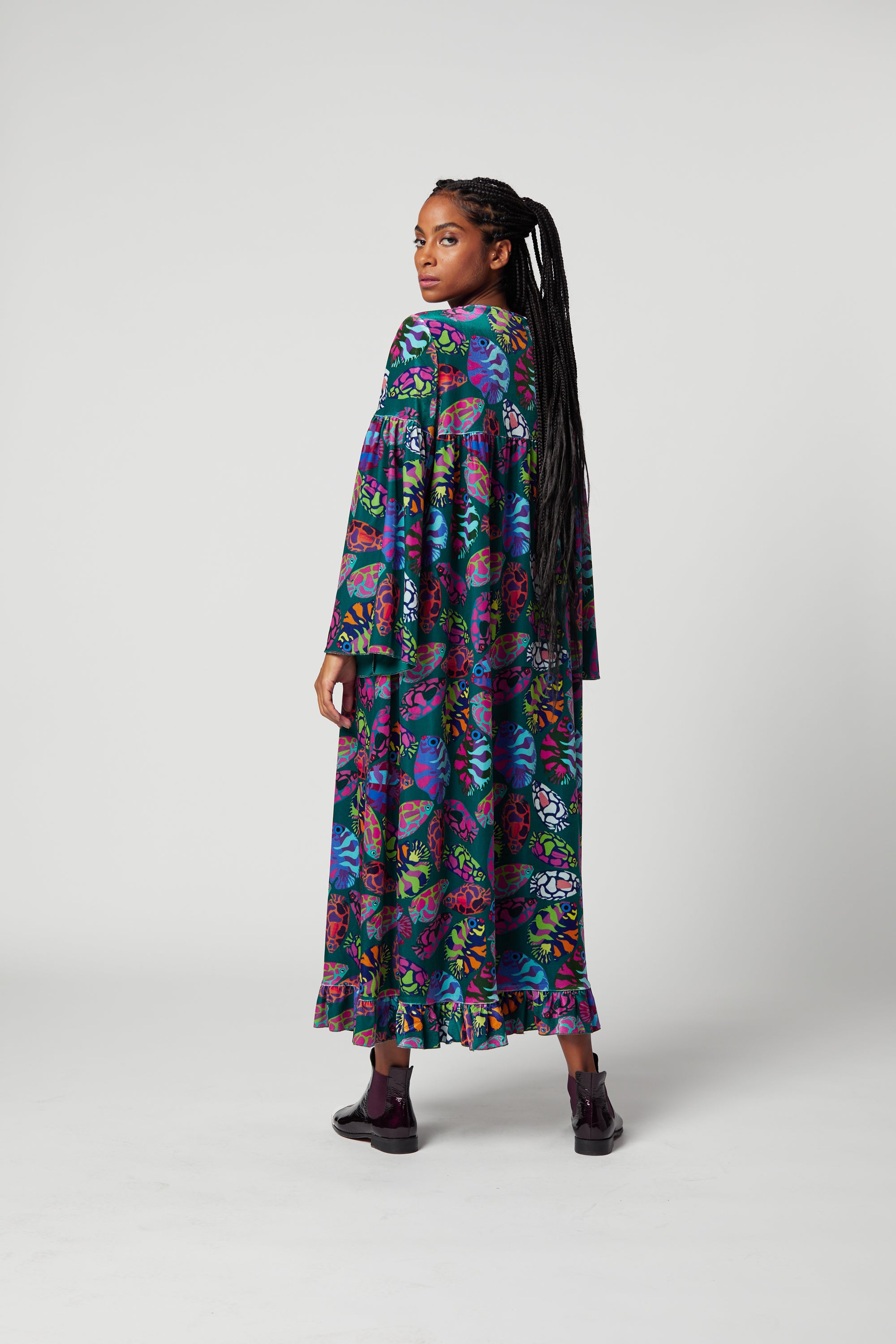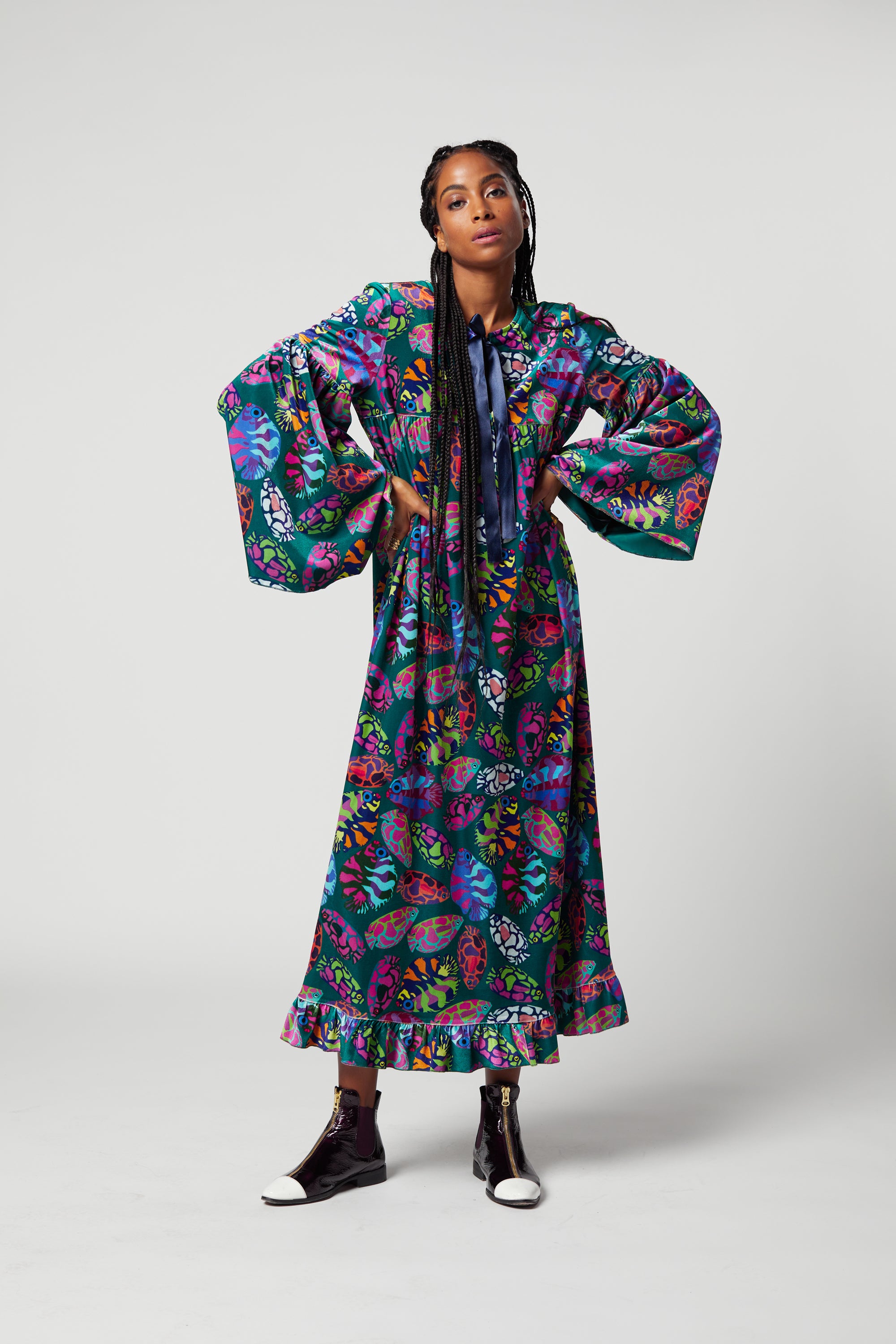 La robe Sperone est une robe longue et féminine inspirée de l'époque victorienne, ample en longueur mais ajustée aux épaules. L'imprimé Gourami sur velours d'une couleur vert émeraude captivante donne une touche sophistiquée et chic à la robe. Les reflets de lumière sont particulièrement somptueux sur cette étoffe.