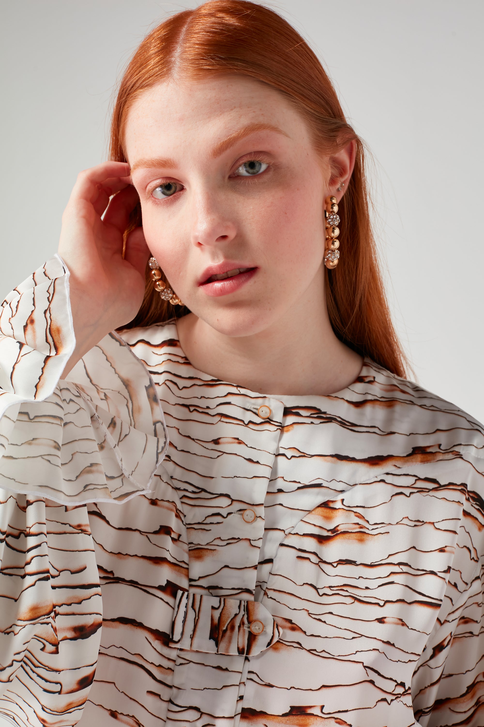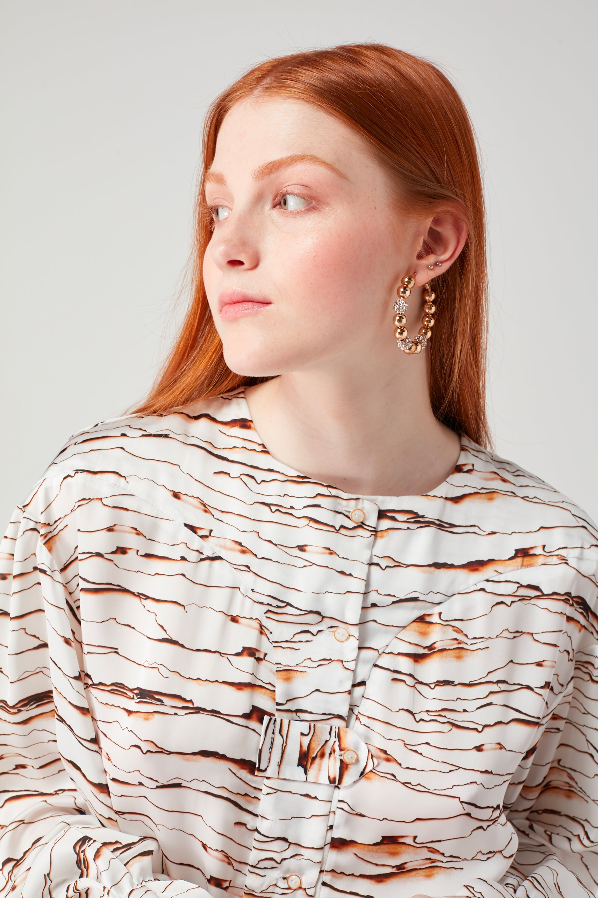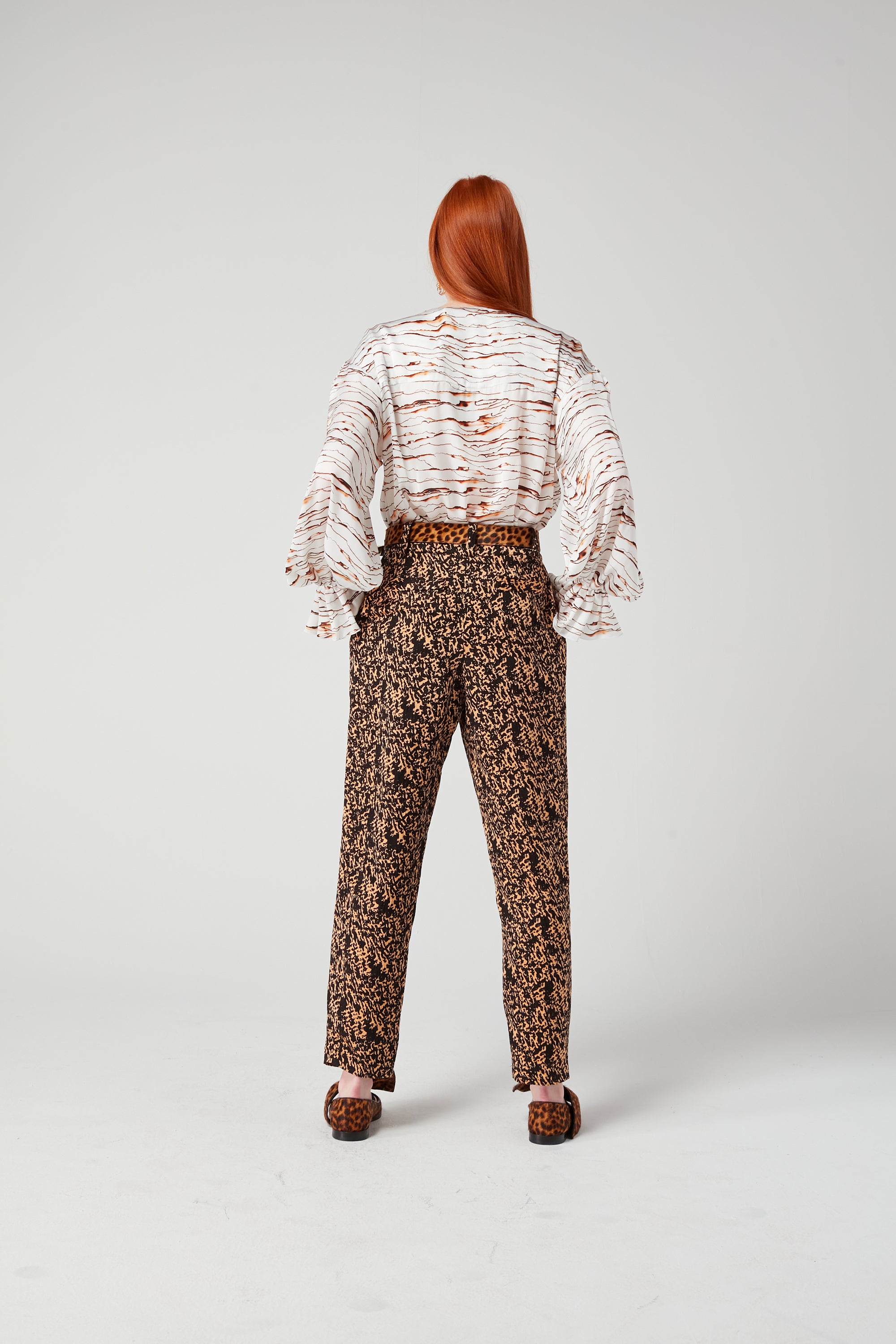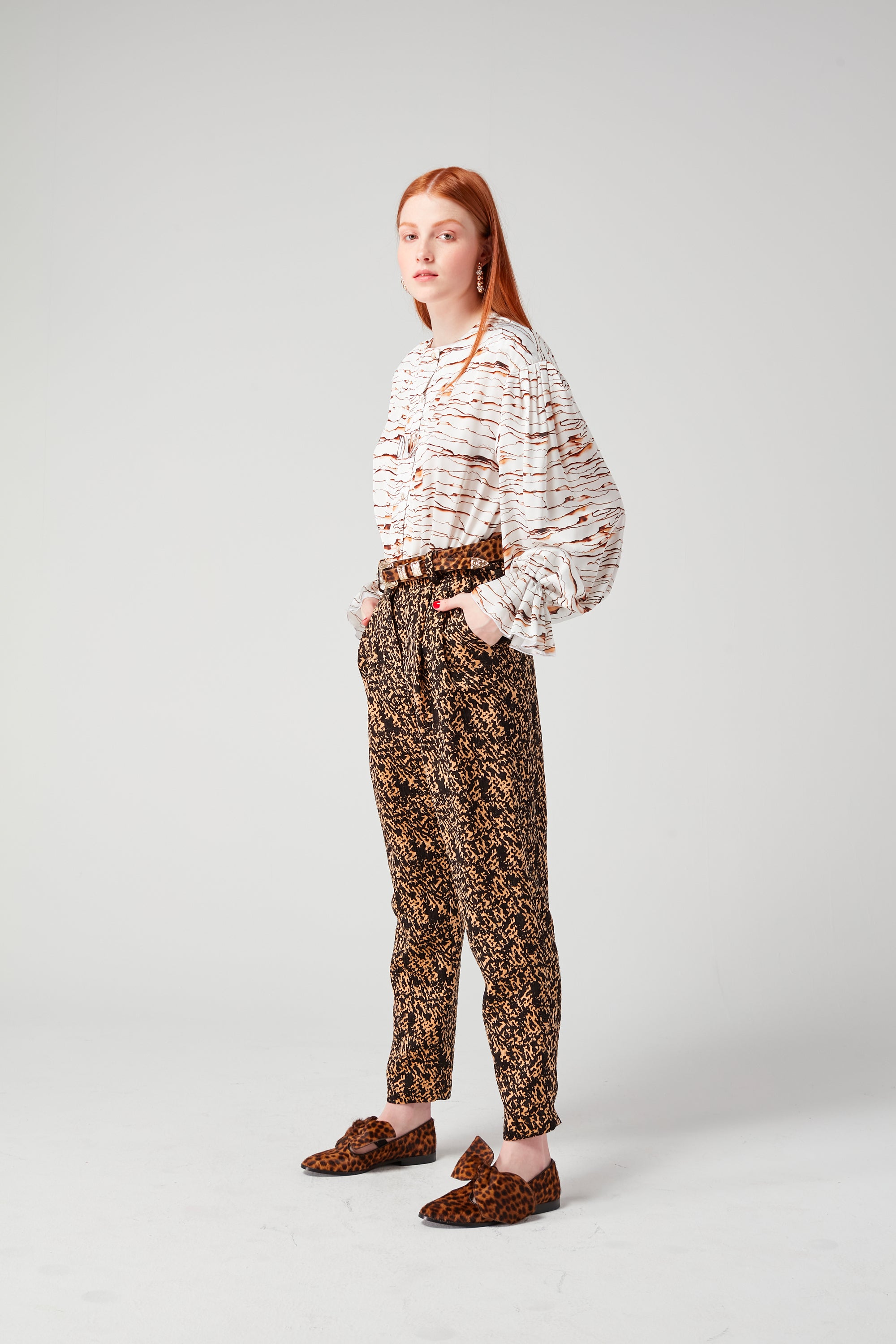 La Trigalière est en train de devenir un modèle emblématique de la collection Heimstone. Cette fois, retrouvez l'iconique Trigalière dans un imprimé Parchemin. Le tissu fin et fluide complète la silhouette ondulée et brulante de l'imprimé et nous montre une fumée nuageuse de papier brûlé qui disparaît lentement. La Trigalière est un haut très romantique accentué par tous les détails délicats choisis spécifiquement pour cette chemise, soit les manches bouffantes, les détails des boutons au niveau du col et les poignets smockés.