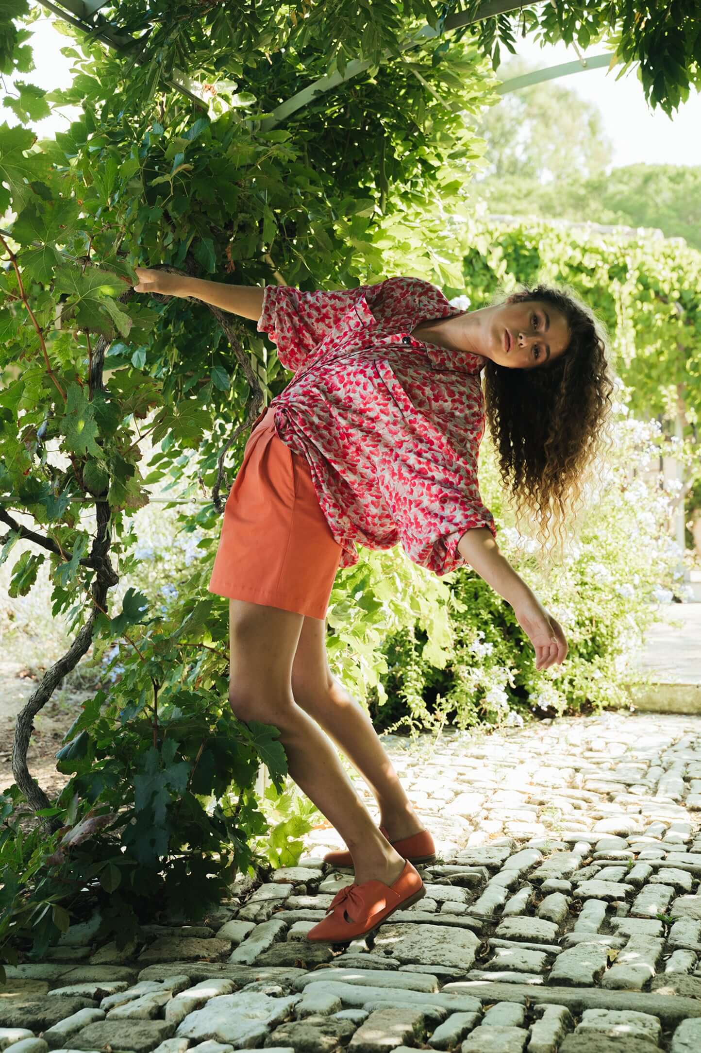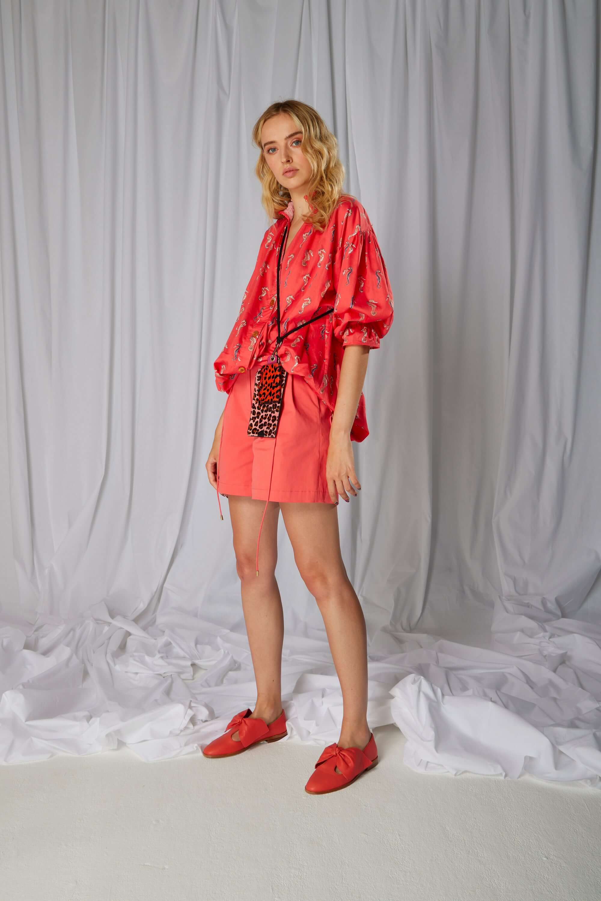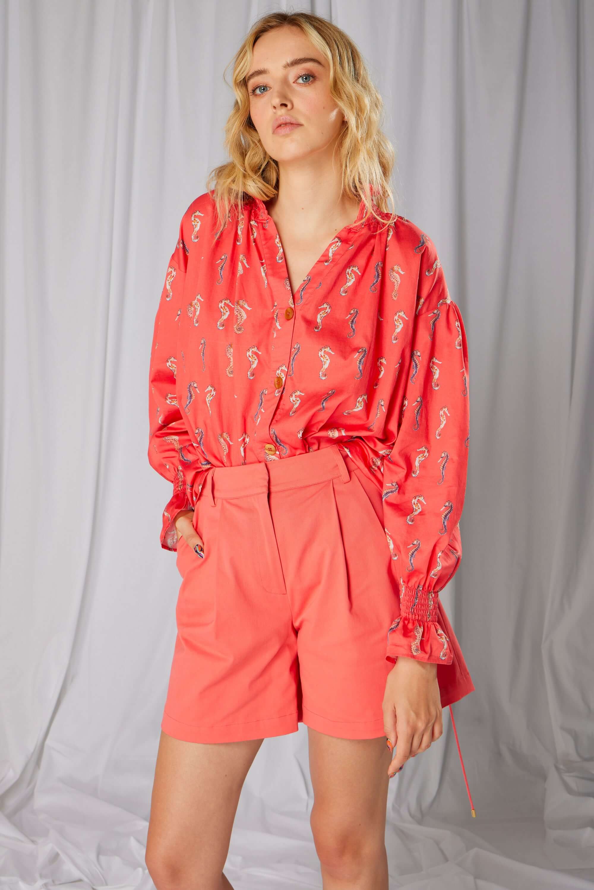 Le short Beckett est une version courte de l'emblématique pantalon Gabriel avec une jambe légèrement évasée. En toile de coton rouge, sa coupe fuselée et épurée est sublimée par une ceinture taille haute et des bords plissés. Des crochets à l'intérieur permettent une fermeture facile.
