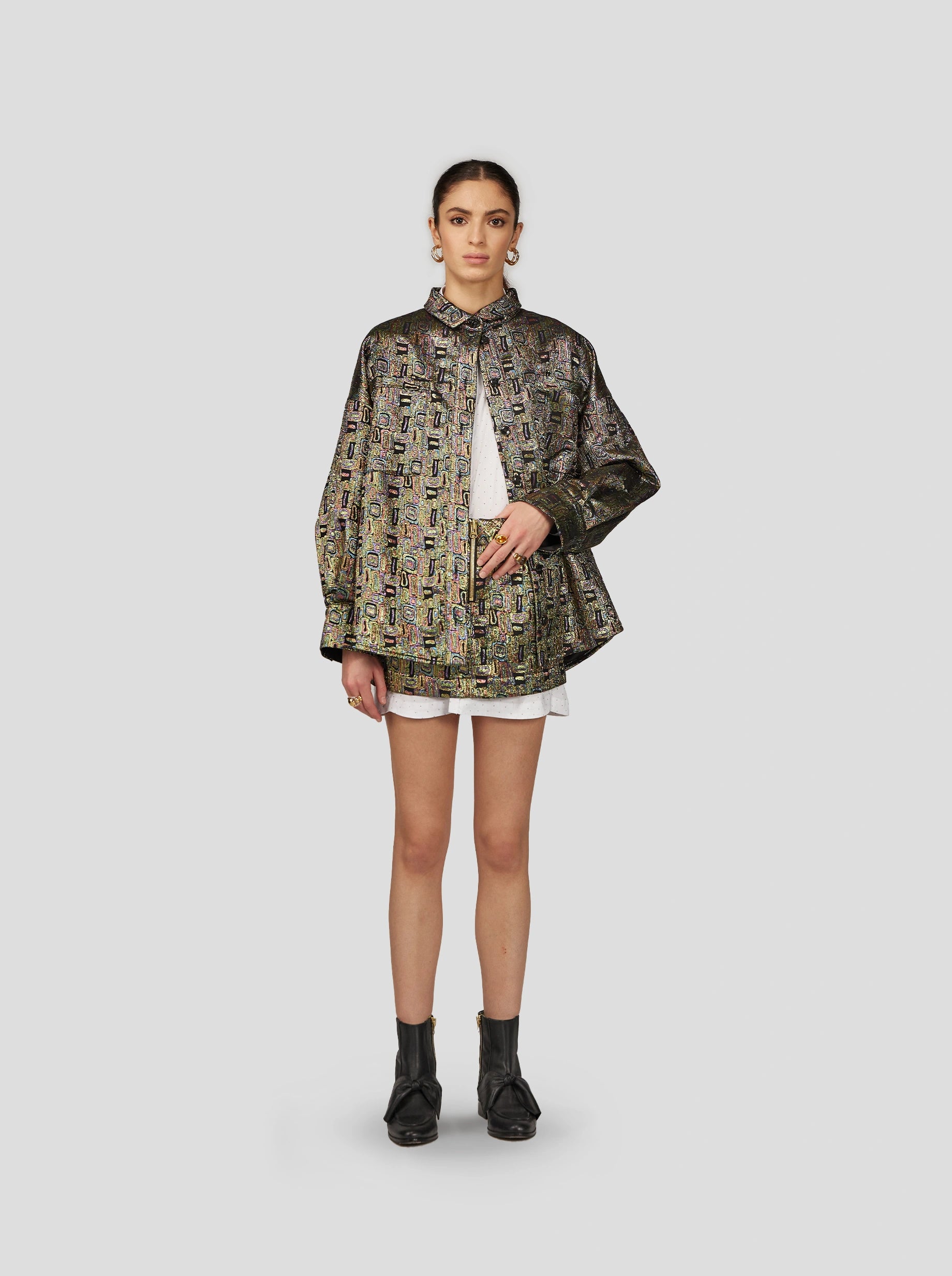 Le tissage Radio présente un motif géométrique réalisé avec des fils métalliques dans des tons d'or, de bronze, d'argent, de vert et de bleu, subtilement décalés au gré de la lumière, le tout sur un fond noir. Ce tissu est à la fois souple et structuré, doublé pour assurer un confort optimal et éviter toute grattage.