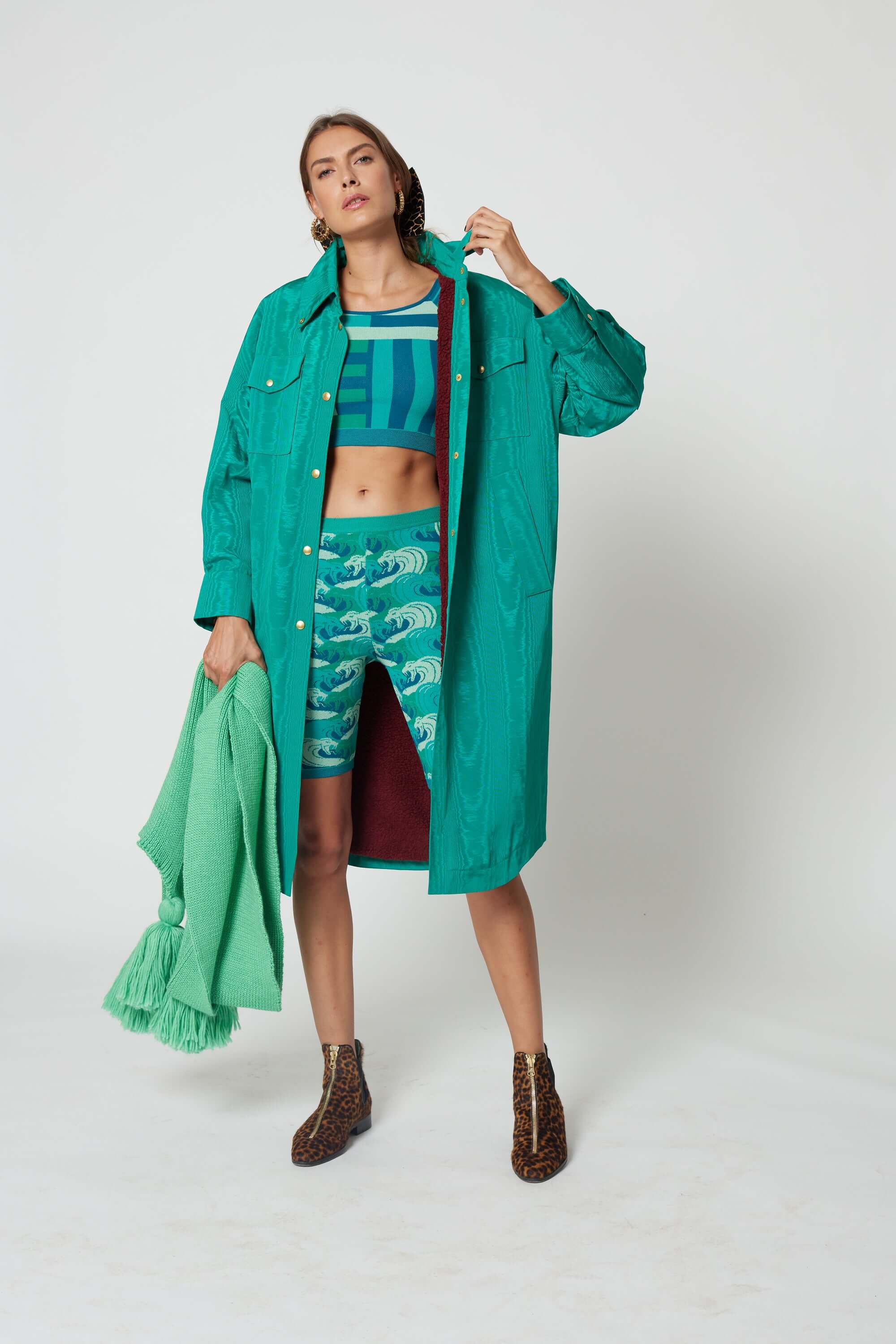 La mannequin mesure 181 cm et porte une taille M.