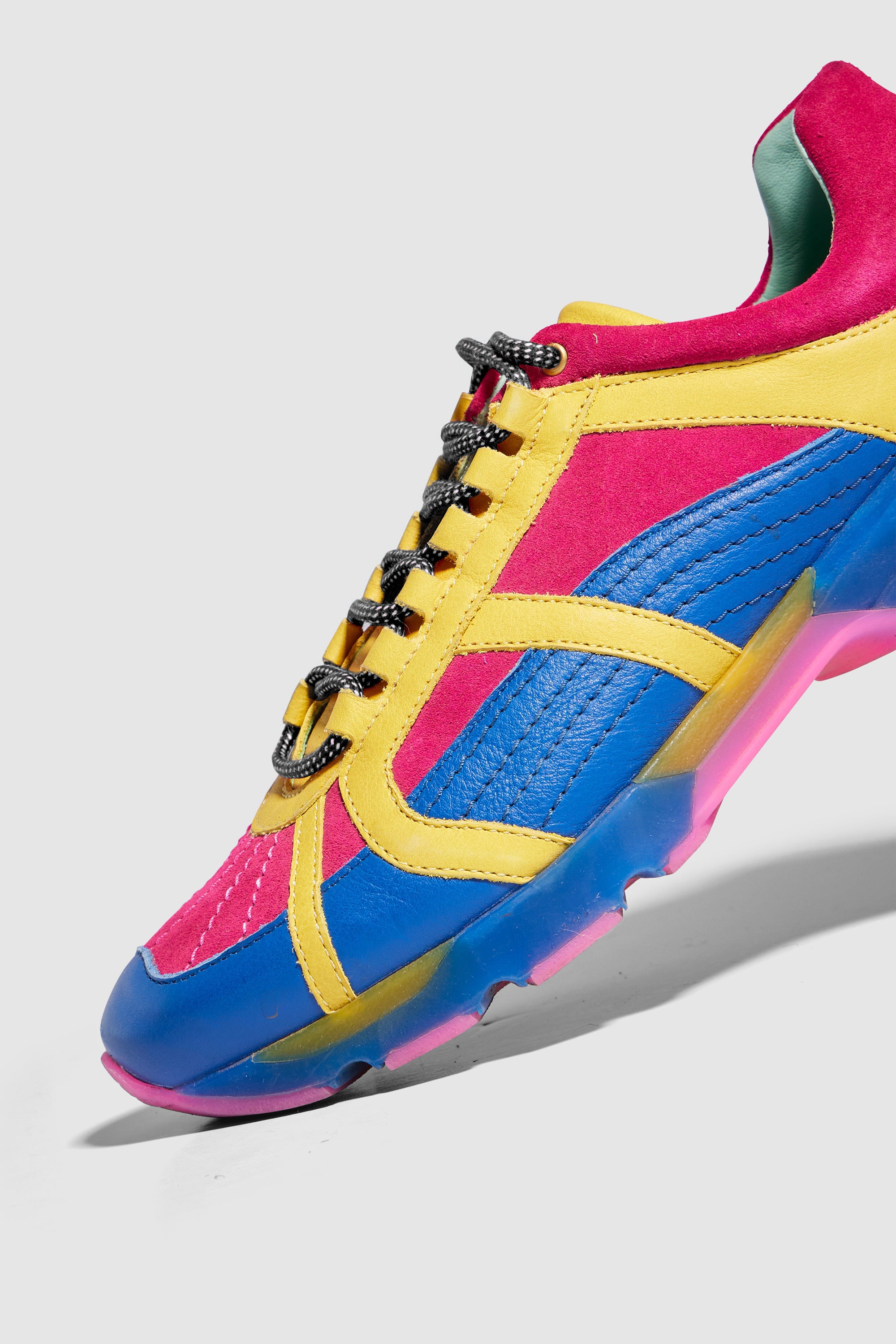 Décontractées et sportives : voici nos nouvelles chaussures de course. Ces chaussures reflètent parfaitement Cuba : chaleur et joie dans un trio de jaune, cyan et magenta. Fabriquées en cuir et daim, elles ont une semelle épaisse en silicone qui les rend confortables. Ces chaussures courent avec des détails et se distinguent par l'association complémentaire des couleurs, ce qui en fait des chaussures élégantes et urbaines.