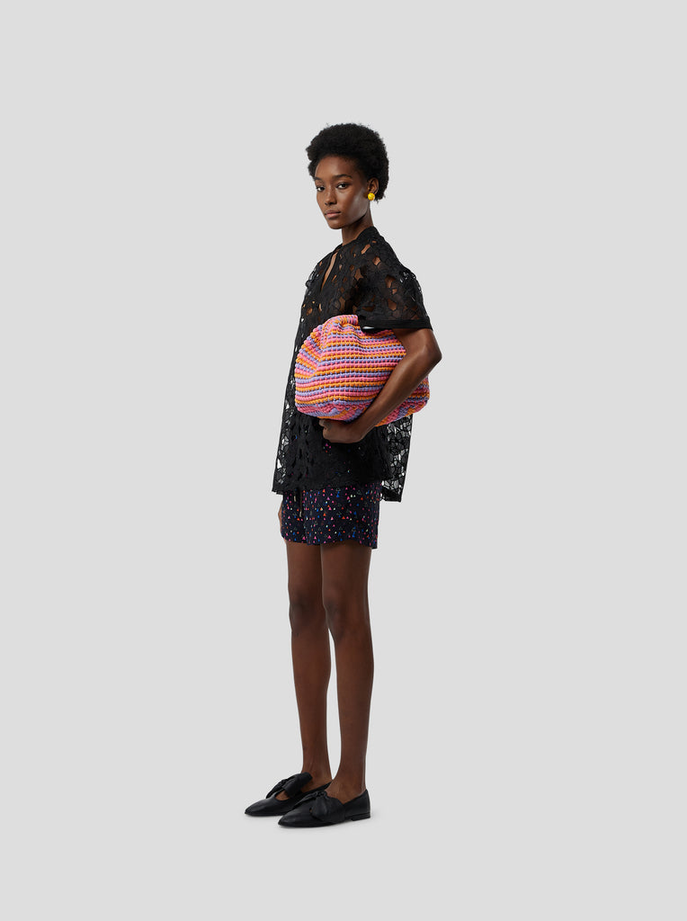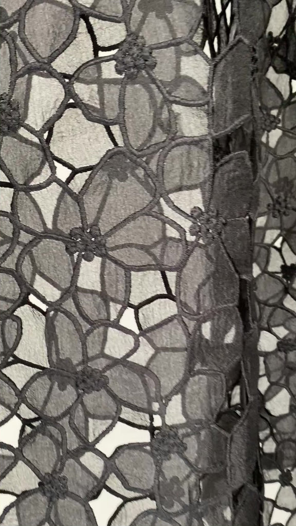 A propos du tissu : La dentelle noire Laurier Brûlé dessine une silhouette à la fois affirmée et lumineuse, tout en conservant une certaine fragilité grâce à son motif ajouré finement travaillé.