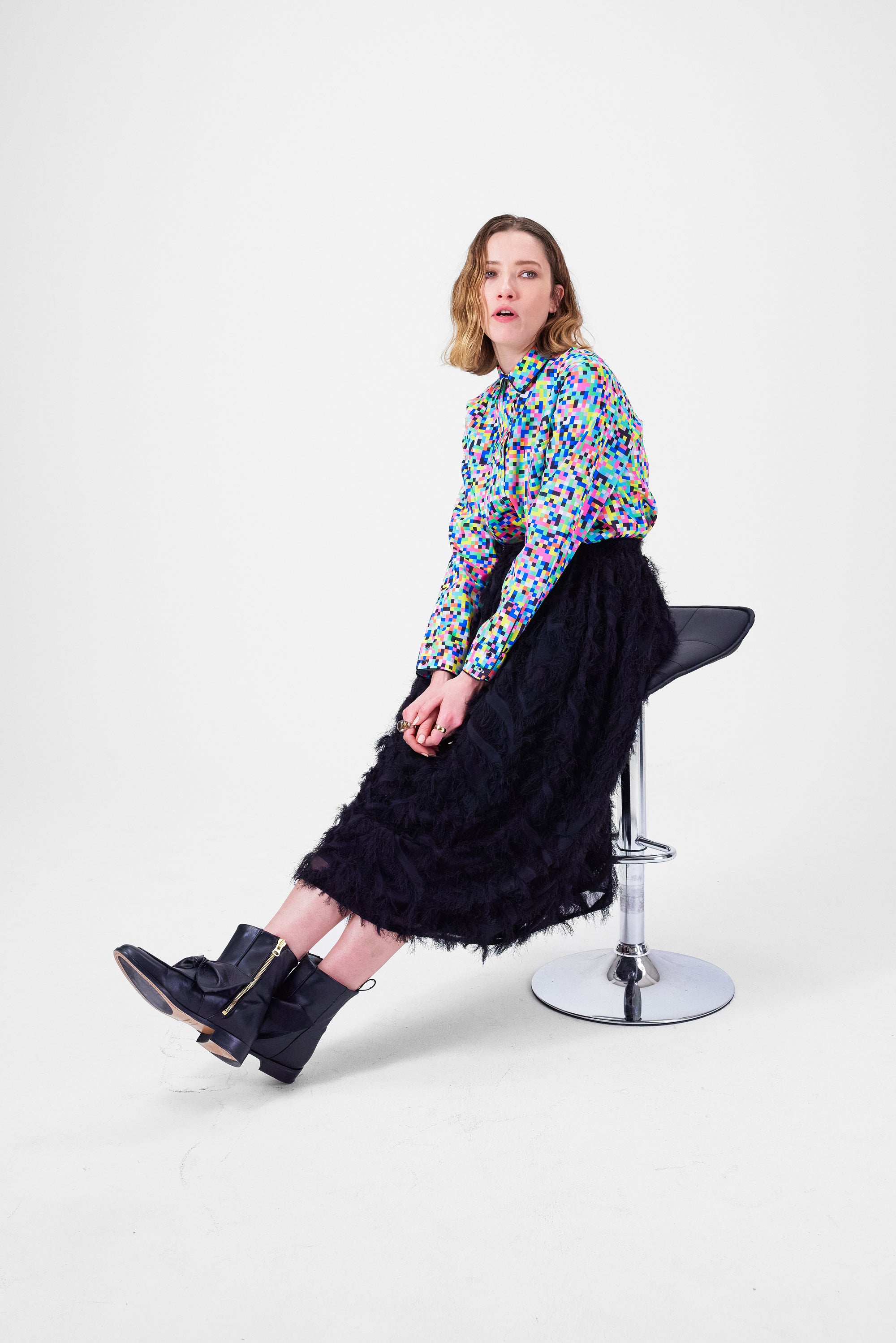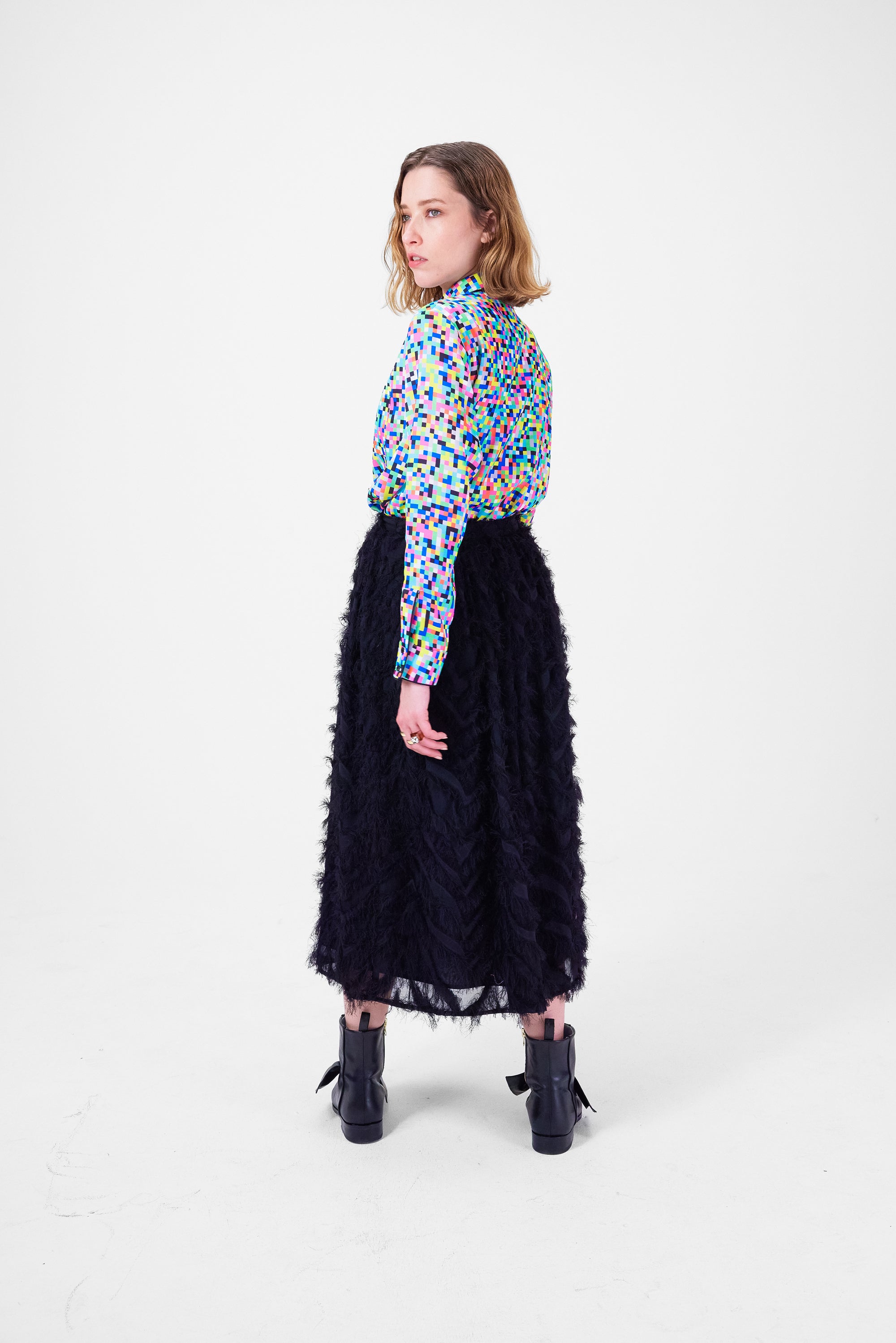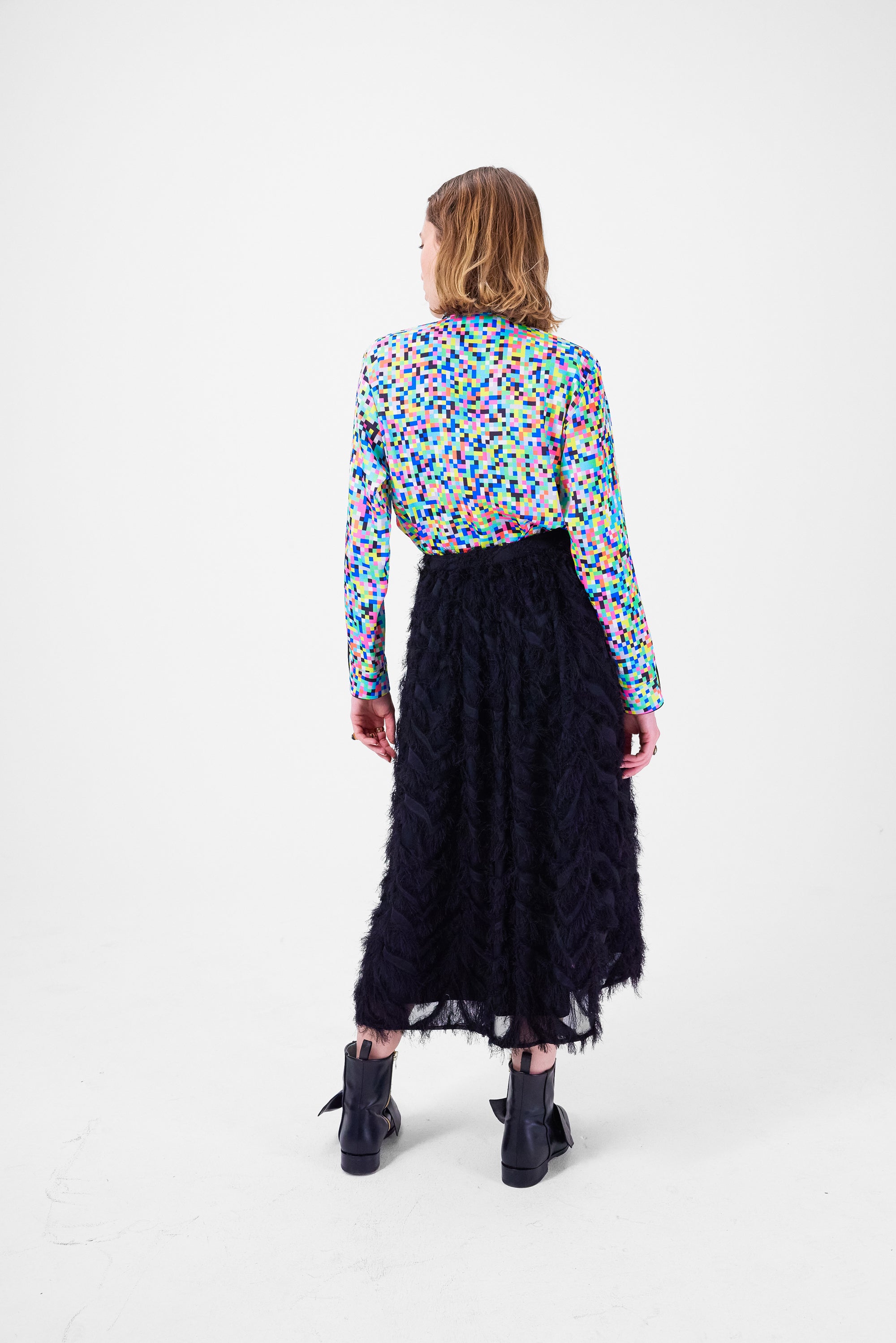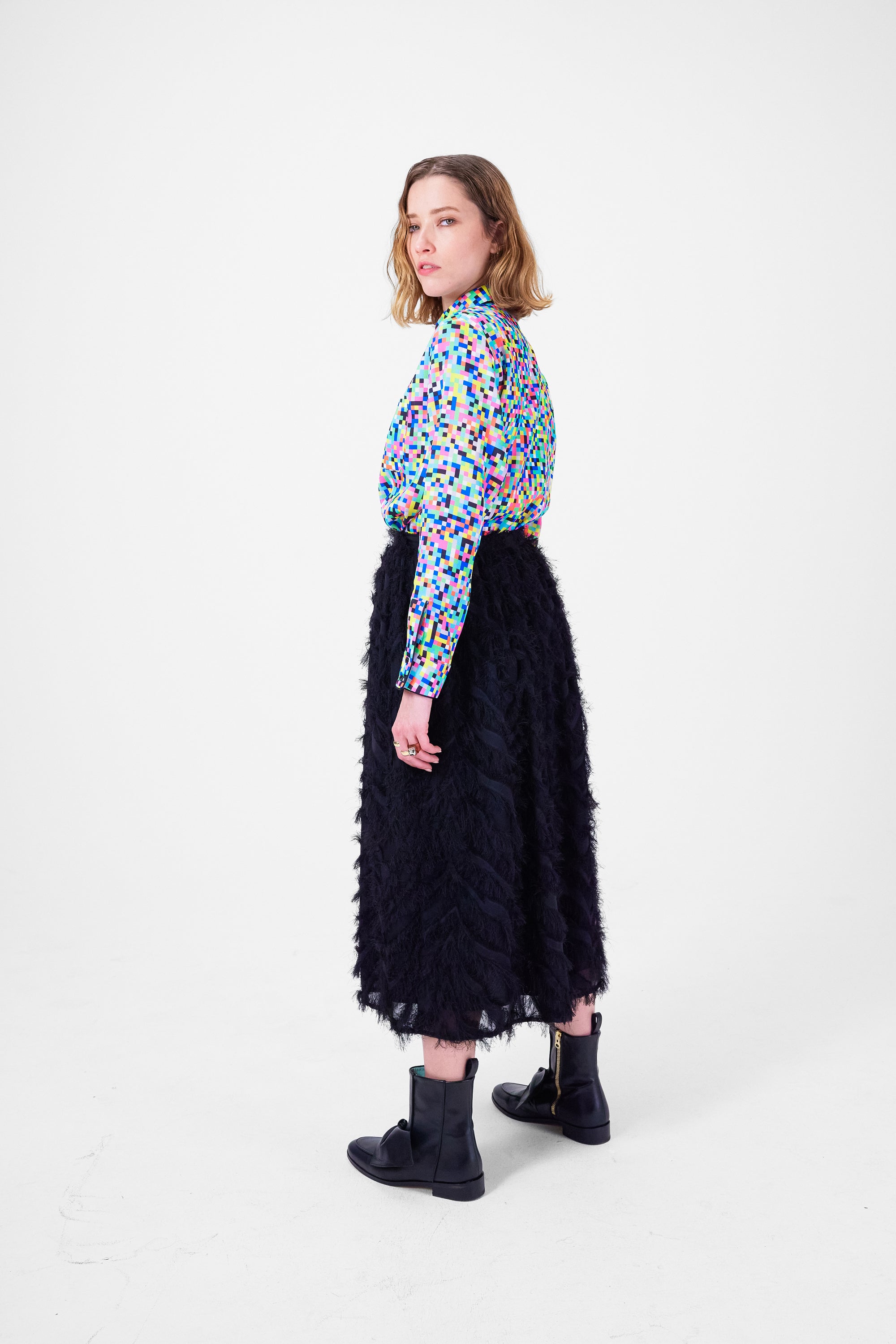 très féminine, à porter à l'occasion des fêtes comme pour une soirée tranquille entre amies. Orné de plumes noirs, il offre un tombé délicat et vaporeux qui habille vos jambes et votre silhouette.