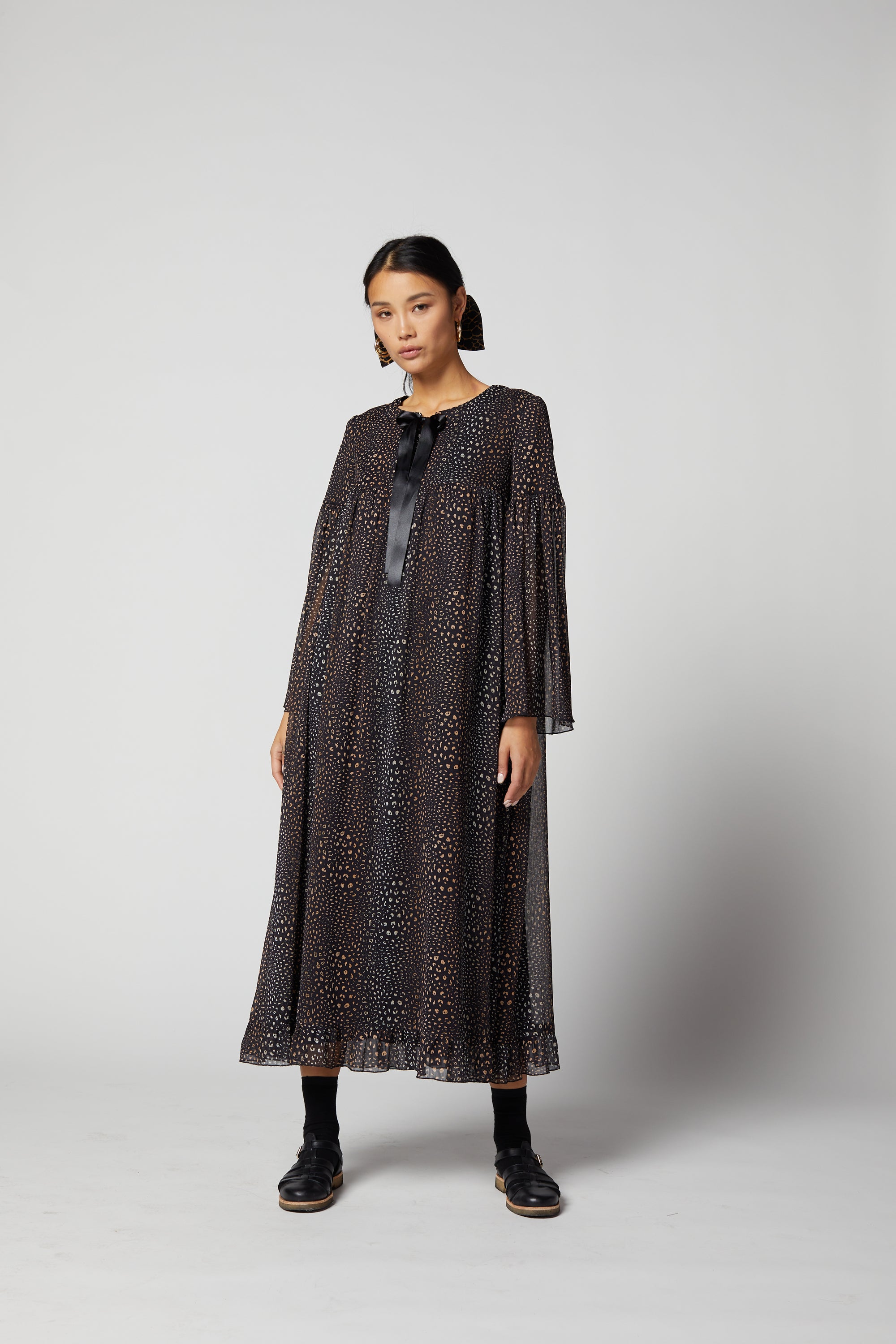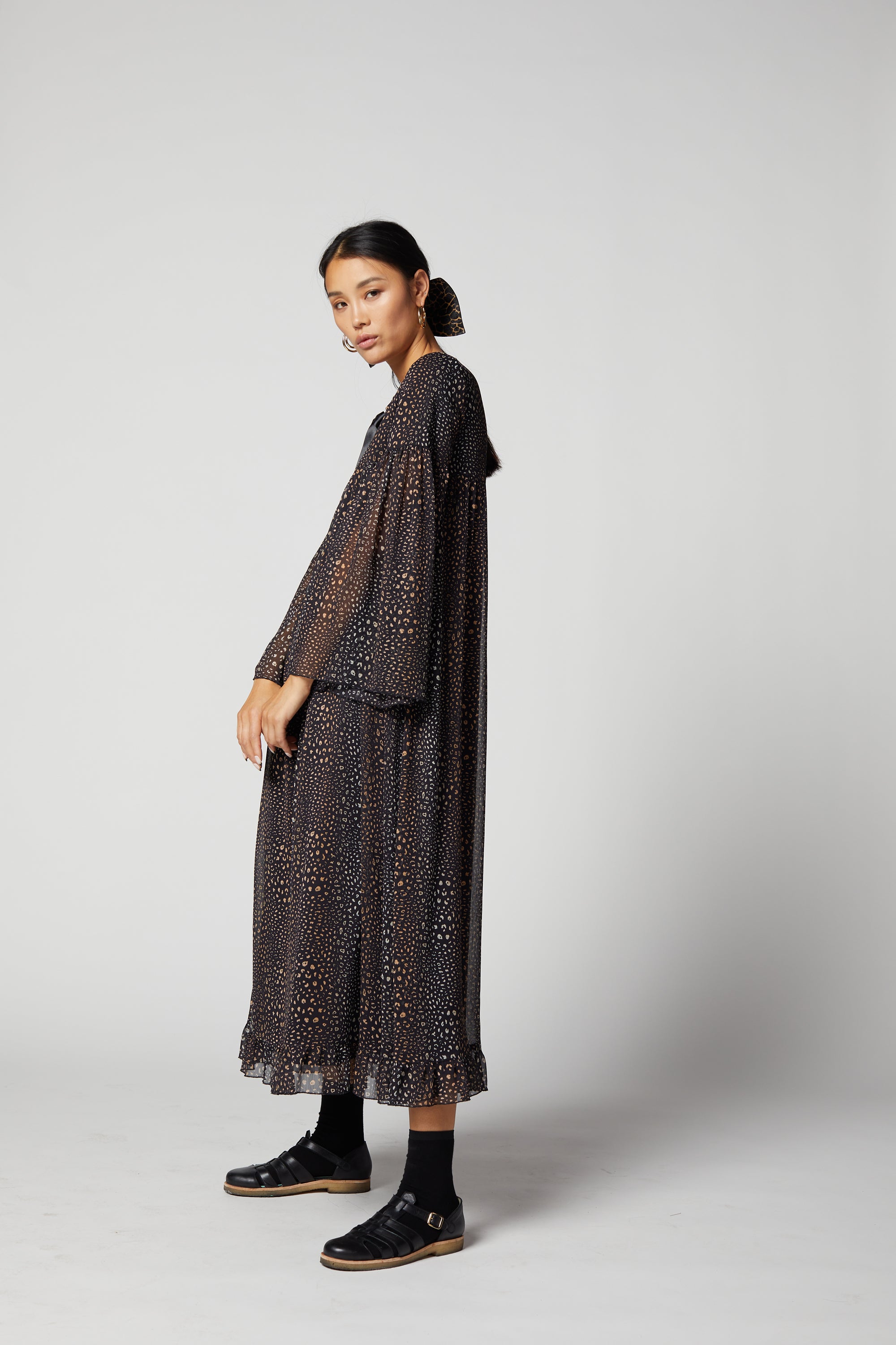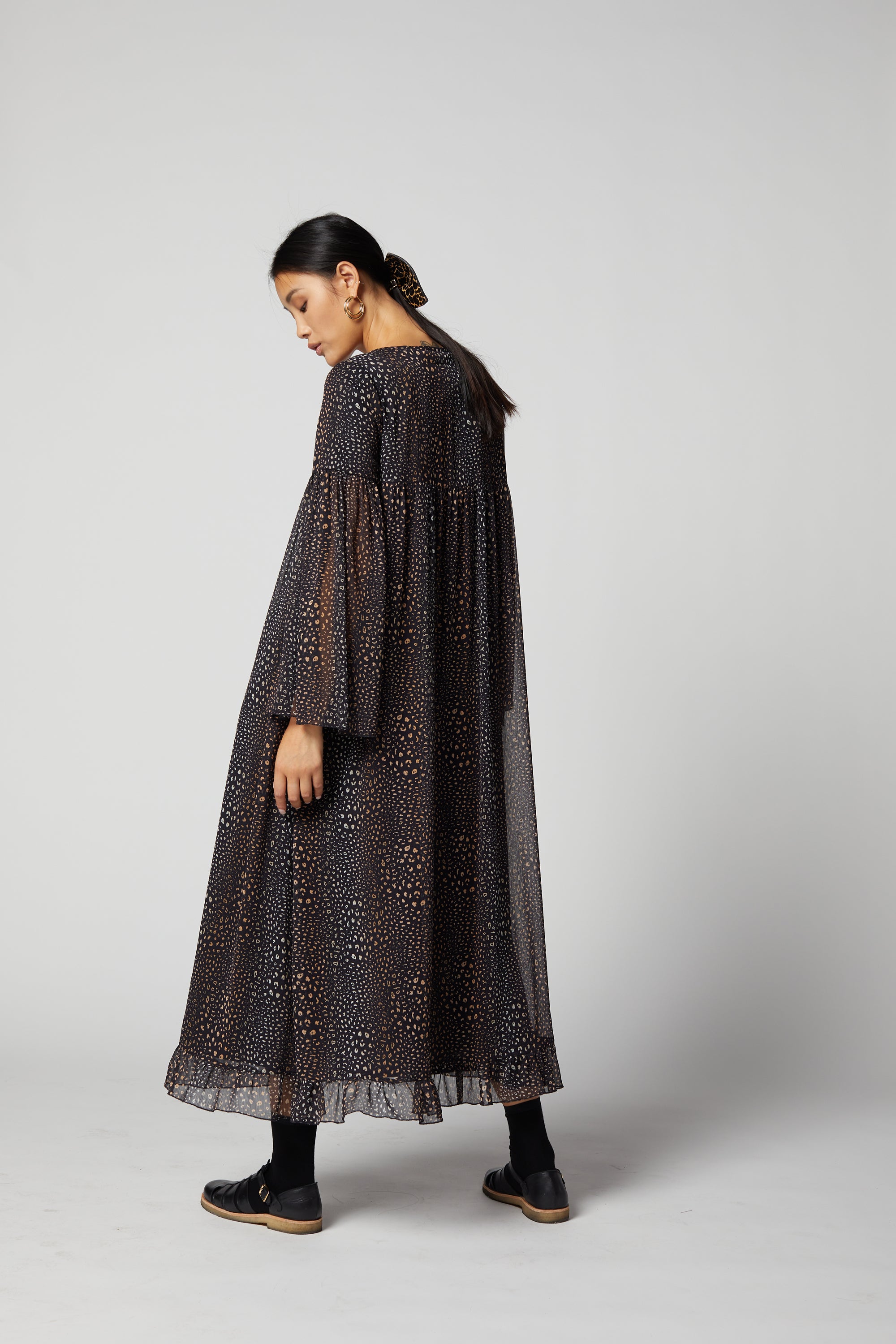 La robe Sperone est une robe longue et féminine inspirée de l'époque victorienne. L'imprimé léopard noir est sobre et captivant et donne un effet sophistiqué et chic à la somptueuse robe. Cette version dans ce tissu fluide et léger est très confortable et les détails transparents apportés par le mélange de deux tissus la rendent si féminine.
