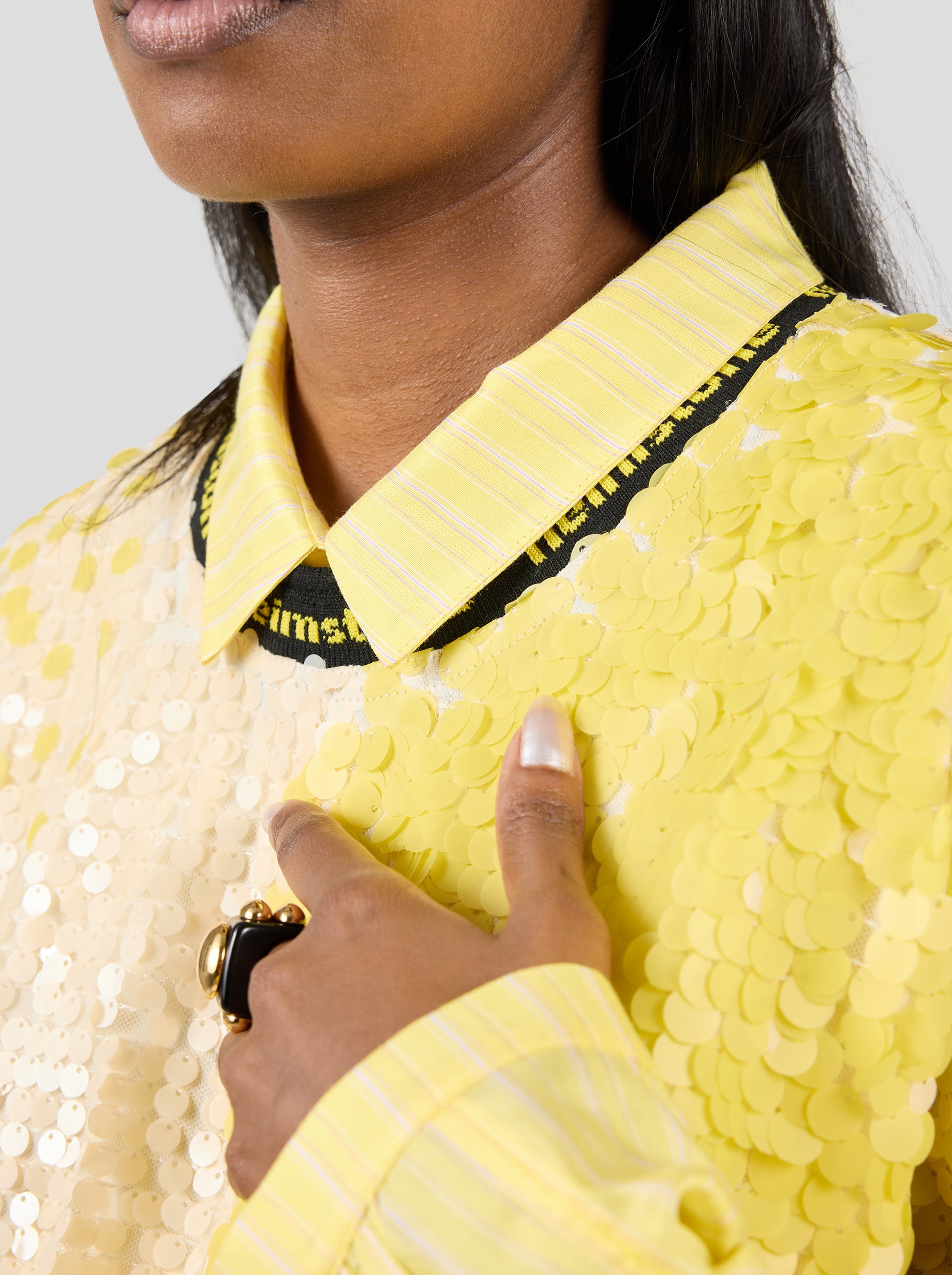 Repasser avec précaution à basse température, en utilisant un linge entre le fer et le tissu pour éviter tout contact direct avec les sequins.