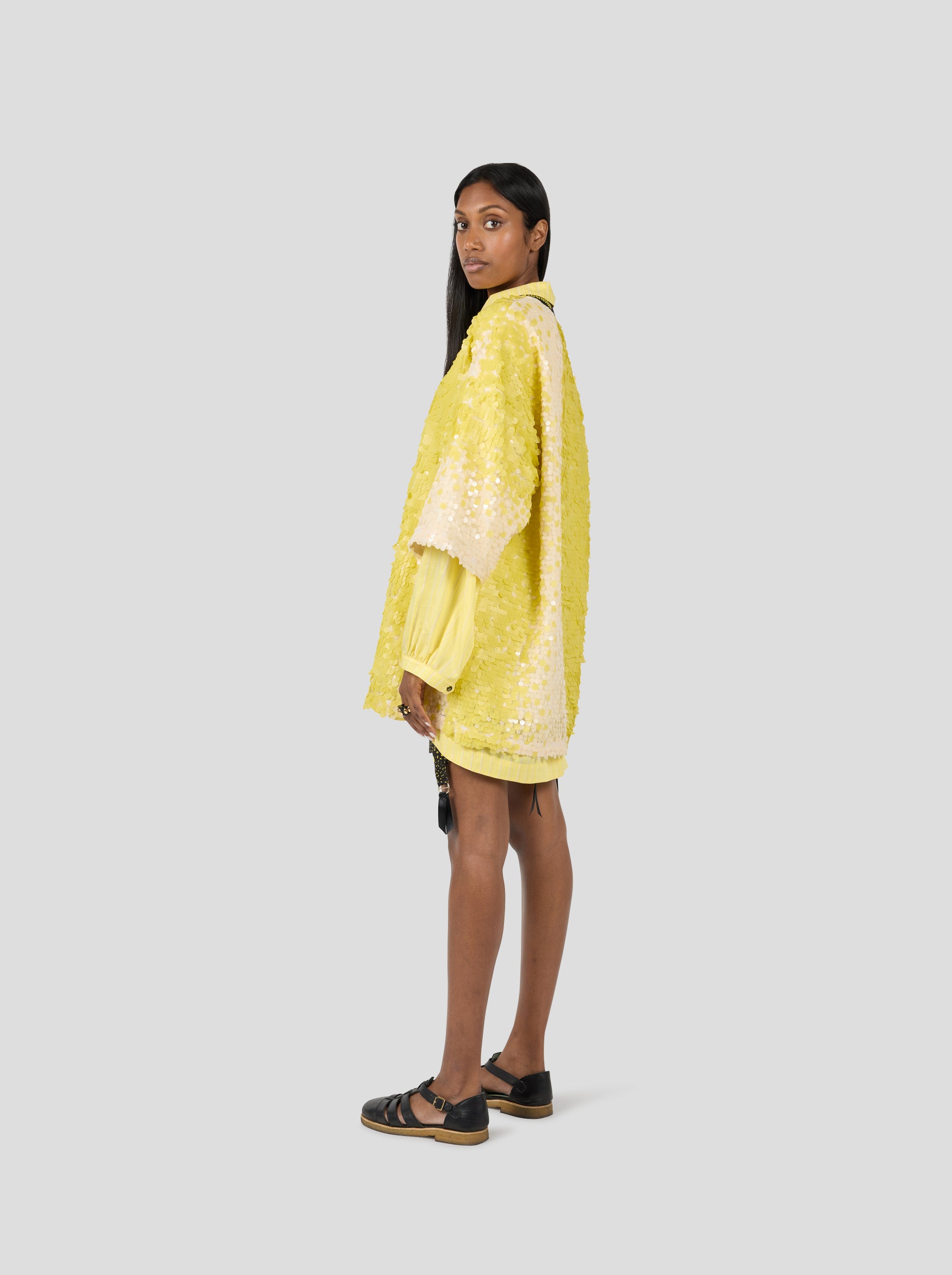 Les nouveaux sequins Meringue, mats mais délicatement chatoyants, se déclinent dans des teintes douces de crème et de jaune pâle, créant une lueur subtile qui captive le regard. Ce tissu se mêle harmonieusement au plumetis fragmenté et à la toile souple Meringue, formant une composition envoûtante de transparences et de contrastes. Un mélange raffiné et sensuel, parfait pour un look irrésistible.