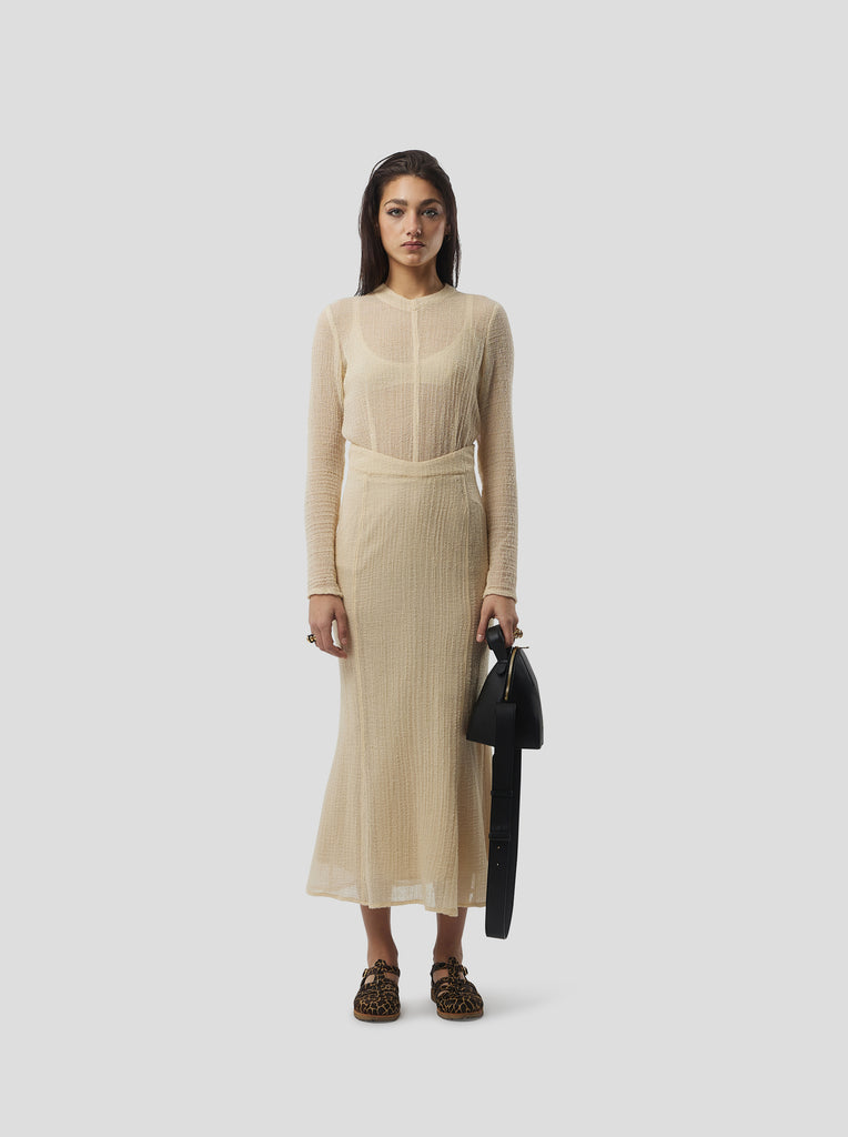 Le tissu Voile salé sable est comme vaporeux, légèrement transparent, avec des fils visibles qui lui donnent du relief, au toucher sec mais doux.