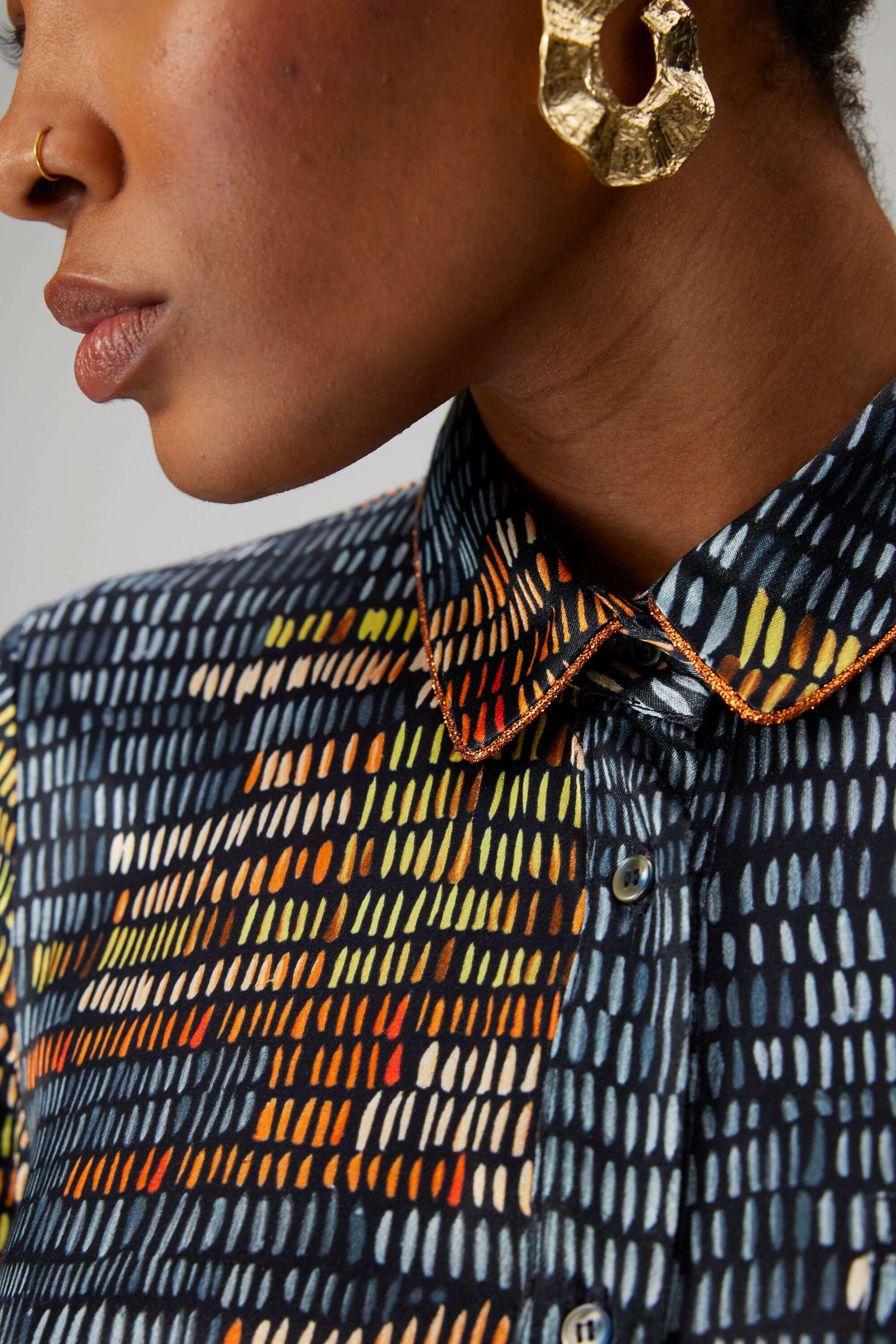 The Edison dress is a loose-fitting shirt dress. It has a black ribbon at the waist to adjust it at the waist if needed. It fastens at the front with tonal buttons. It has a masculine collar with bronze piping detail.