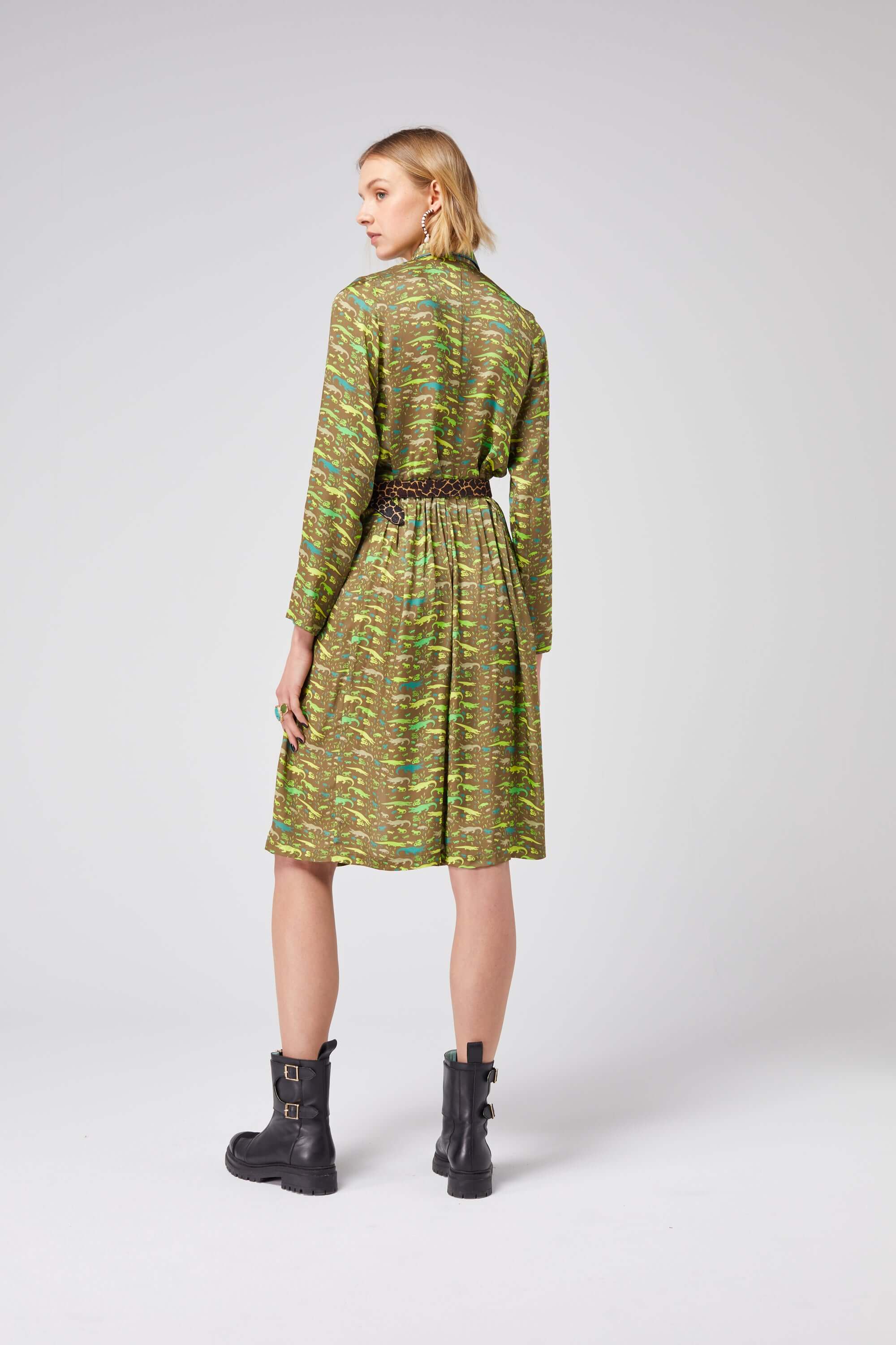 The Edison dress is a shirt dress with adjusted shoulders and a loose shape on the body. You can tighten the waist with the cord to underline your waist. The light and fluid fabric embraces a straight cut that will enhance your silhouette. The collar has a pining details that brings a sophisticated touch to the dress.