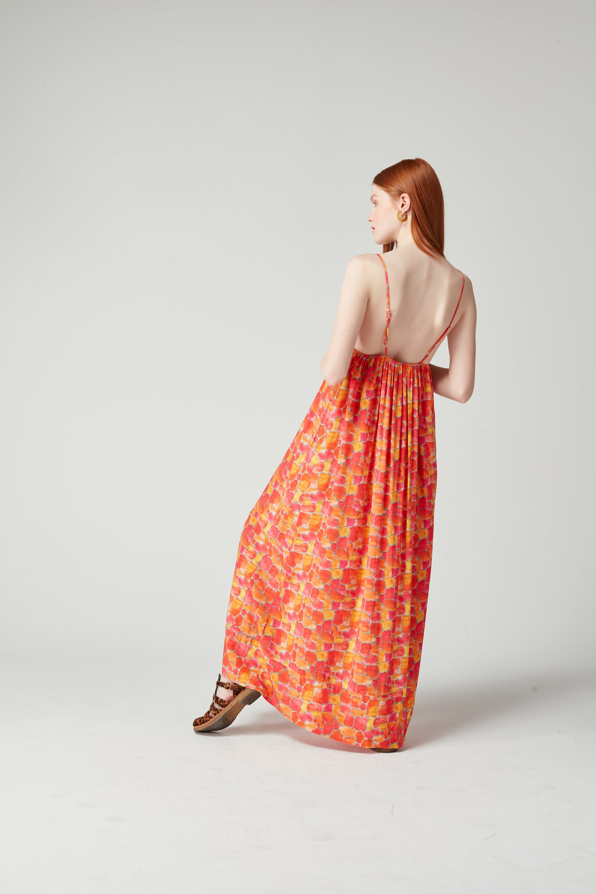 The Rita dress is inspired by the apron dresses. It has a square neck, thin adjustable straps and a slight open back. The fabric is light, soft and allows the dress to have a flowing fall and a delicate movement. The finish of is matte which accentuates the colors and pattern of the dress and it has a cotton feel.