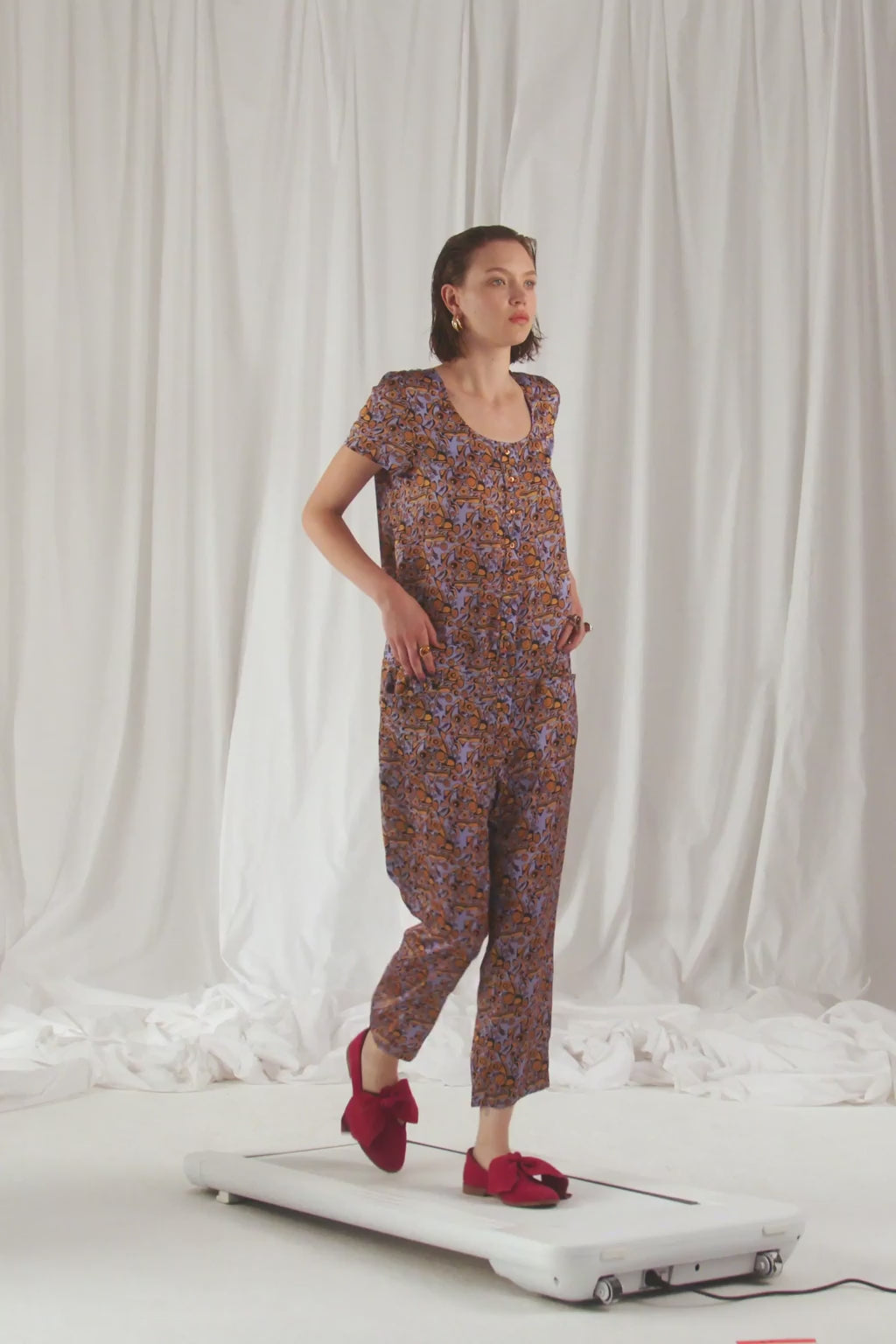 Made from a shimmering satin polyester, the Woods jumpsuit returns in a bright, vintage Art Deco print. Long and short-sleeved, it features straight legs and a low waistband at the hips.